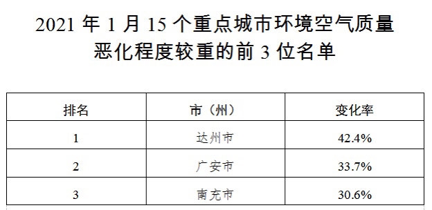 今年1月,四川15个空气质量重点城市(2015年未达标城市)中空气质量较好的前3名依次为雅安市、遂宁市、广安市;空气质量较差的后3名依次为达州市、自贡市、德阳市。空气质量恶化程度较重的前3名依次为达州市、广安市、南充市。这是记者3月8日在四川省生态环境厅召开的新闻发布会上获悉的。