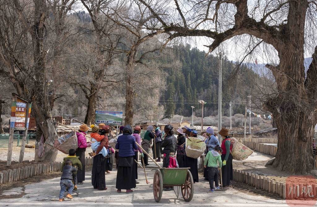 从阿坝州若尔盖县城北上,草原风光随着地形变化逐渐进入山峦间原始森林。在四川省与甘肃省交界处,若尔盖县铁布镇热盖村坐落在风景如画的原始森林间,3月8日一早,村里的妇女们拿着各自的工具到村旁林间清理杂物落叶,开展森林防火工作。
