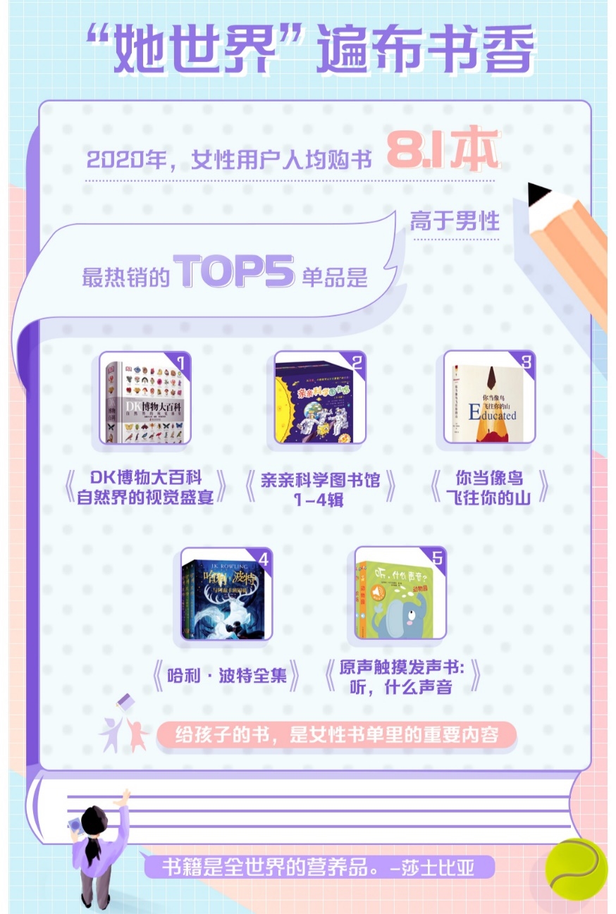 而从成交额来看,2020年女性用户购买的财经知识类书籍中,《价值:我对投资的思考》《苏世民:我的经验与教训》《富爸爸穷爸爸》《卓有成效的管理者》《贫穷的本质:我们为什么摆脱不了贫穷》是最热销的TOP5单品。