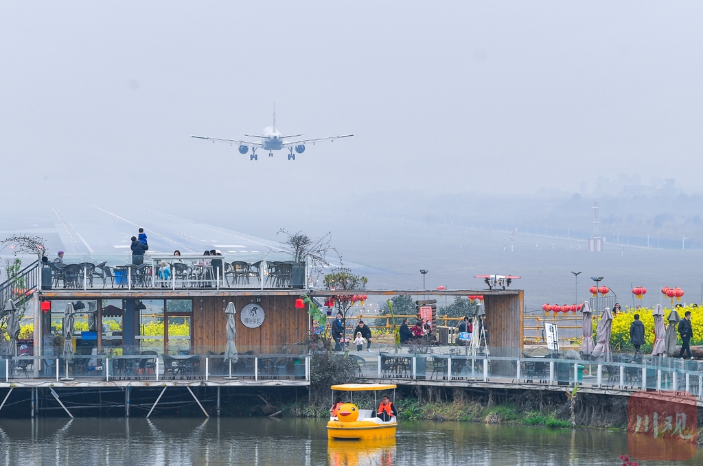 3月10日,成都市双流区空港花田,金黄的油菜花开得正艳,每隔3、5分钟就有一架飞机从油菜花海上空飞过。花海中的游客见到飞机纷纷摆出最好的姿势与飞机合影。油菜花加飞机,这是成都特有的景观,这里又再次成为网红打卡地。