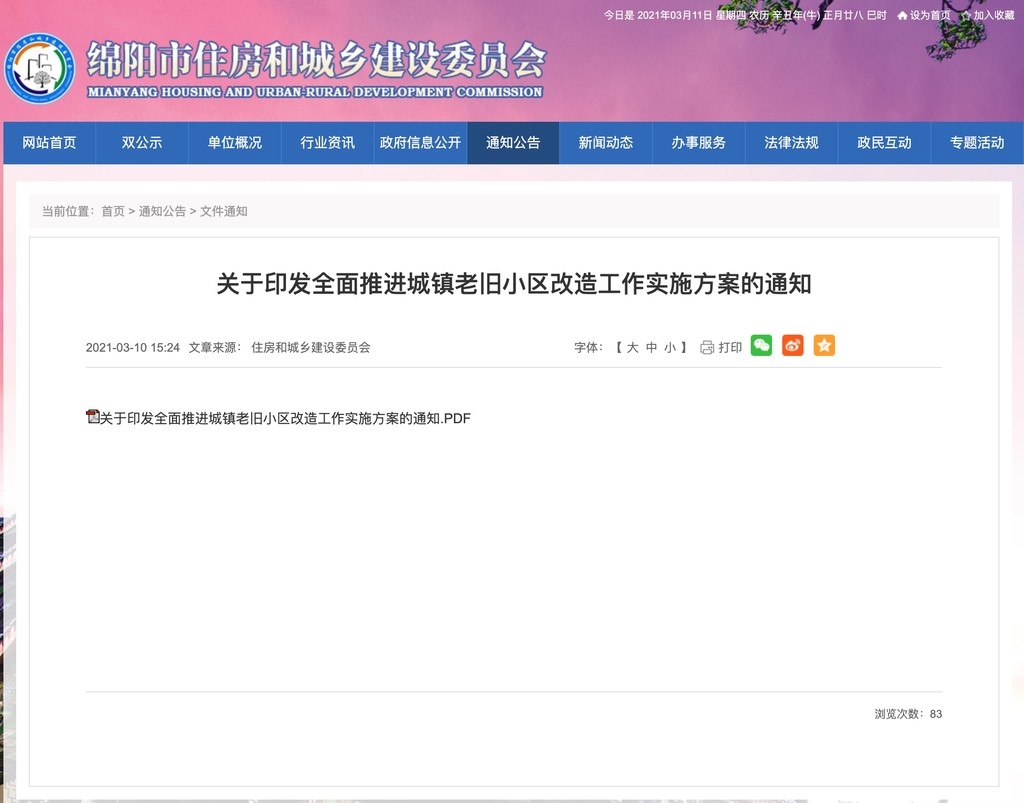 按照《方案》要求,绵阳各县(市、区)政府、园区管委会根据本辖区内老旧小区总体情况编制老旧小区改造专项规划,力争“十四五”期末基本完成2000年底前建成的老旧小区基础类改造。