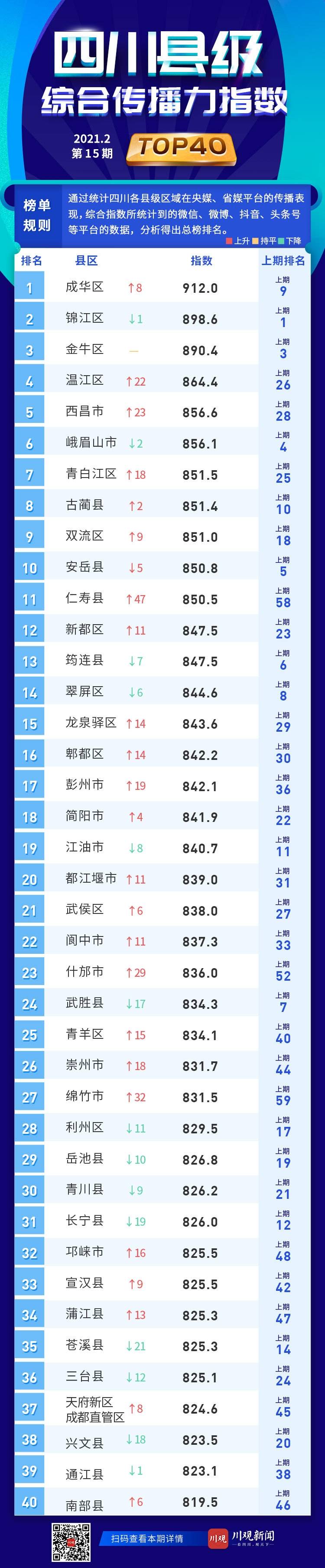 综合传播力指数前40名依次是:成华区、锦江区、金牛区、温江区、西昌市、峨眉山市、青白江区、古蔺县、双流区、安岳县、仁寿县、新都区、筠连县、翠屏区、龙泉驿区、郫都区、彭州市、简阳市、江油市、都江堰市、武侯区、阆中市、什邡市、武胜县、青羊区、崇州市、绵竹市、利州区、岳池县、青川县、长宁县、邛崃市、宣汉县、蒲江县、苍溪县、三台县、天府新区成都直管区、兴文县、通江县、南部县。