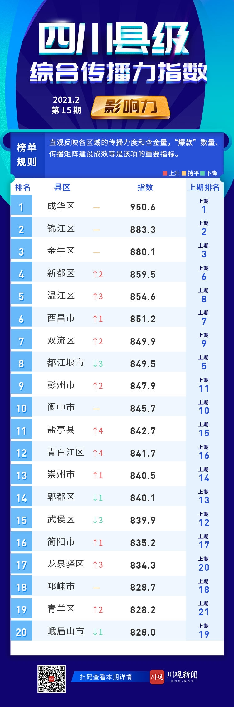 从影响力前20名统计结果看,成都市成华区蝉联第一;绵阳市盐亭县、成都市青白江区排名上升较多。