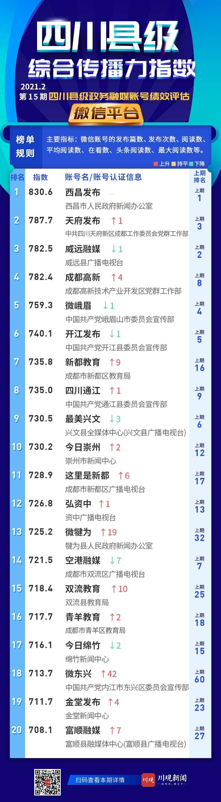 微信平台前20名账号依次是:西昌发布、天府发布、威远融媒、成都高新、微峨眉、开江发布、新都教育、四川通江、最美兴文、今日崇州、这里是新都、弘资中、微犍为、空港融媒、双流教育、青羊教育、今日绵竹、微东兴、金堂发布、富顺融媒。