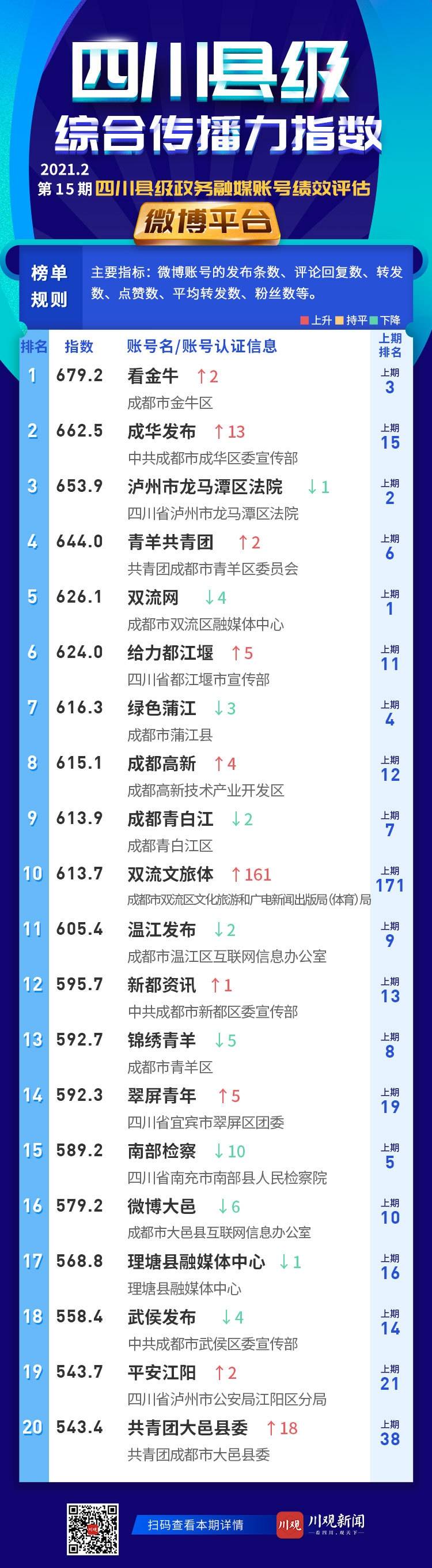 微博平台前20名账号依次是:看金牛、成华发布、泸州市龙马潭区法院、青羊共青团、双流网、给力都江堰、绿色蒲江、成都高新、成都青白江、双流文旅体、温江发布、新都资讯、锦绣青羊、翠屏青年、南部检察、微博大邑、理塘县融媒体中心、武侯发布、平安江阳、共青团大邑县委。