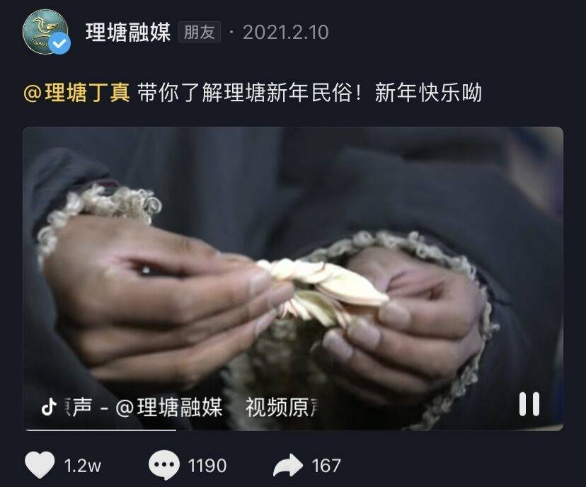 四川特色春节民俗成宣传热点,尤其受短视频平台青睐。受疫情影响,不少线下年俗活动都转为线上庆祝,也因此通过互联网获得更大的关注度。微信号“微彭山”发布《今天起,“非遗”陪你闹新春!》详尽介绍了当地特色春节节目,如“保胜幺妹灯”“ 黄丰草龙”等,干货满满。抖音号“理塘融媒”发布由丁真出演的“@理塘丁真 带你了解理塘新年民俗!新年快乐呦”视频,“泸县融媒”在发布的系列春节习俗视频,在短视频平台传播效果好。