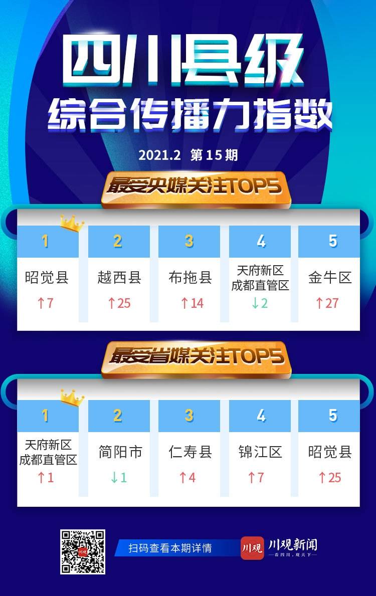 3月11日,四川县级综合传播力指数第15期(2021年2月)发布。本期指数的数据采集时间段是2021年2月1日至2月28日,共涉及3.5万余个有效活跃账号、76万余篇文章(视频、网页)。