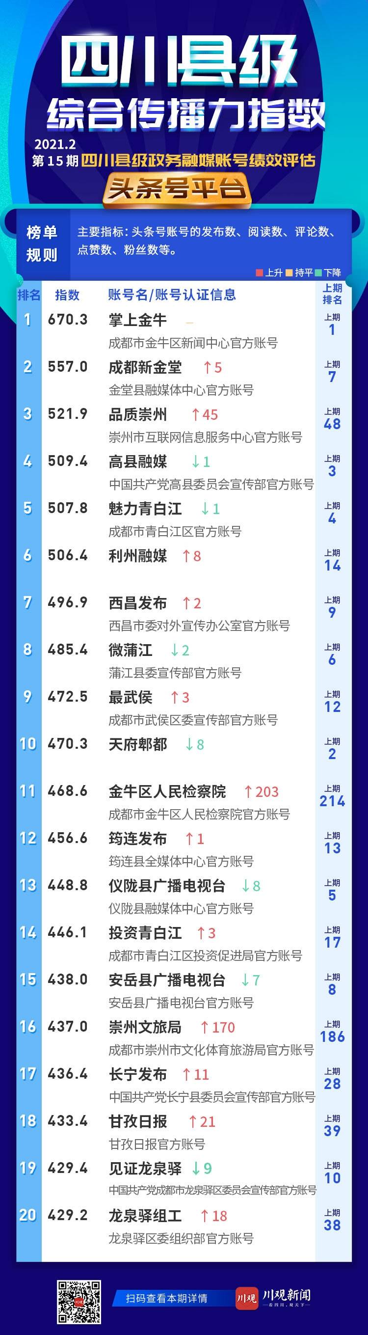 头条号平台前20名账号依次是:掌上金牛、成都新金堂、品质崇州、高县融媒、魅力青白江、利州融媒、西昌发布、微蒲江、最武侯、天府郫都、金牛区人民检察院、筠连发布、仪陇县广播电视台、投资青白江、安岳县广播电视台、崇州文旅局、长宁发布、甘孜日报、见证龙泉驿、龙泉驿组工。