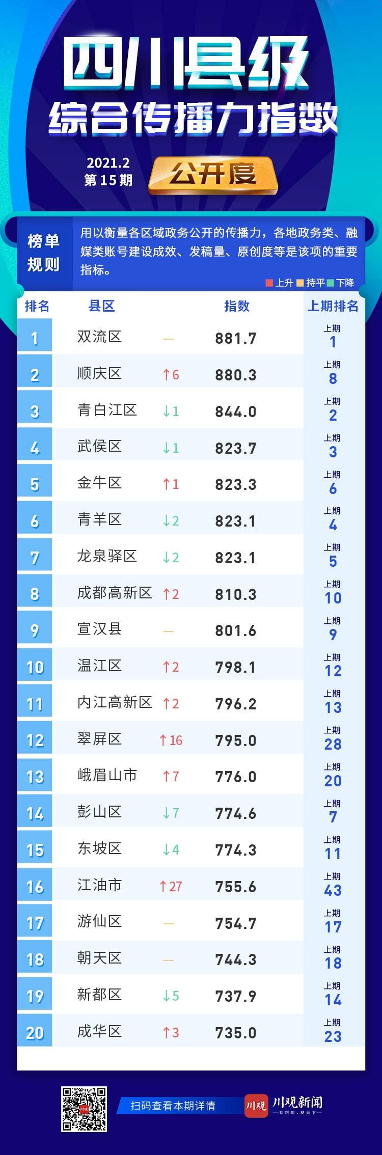公开度前20名依次是:双流区、顺庆区、青白江区、武侯区、金牛区、青羊区、龙泉驿区、成都高新区、宣汉县、温江区、内江高新区、翠屏区、峨眉山市、彭山区、东坡区、江油市、游仙区、朝天区、新都区、成华区。