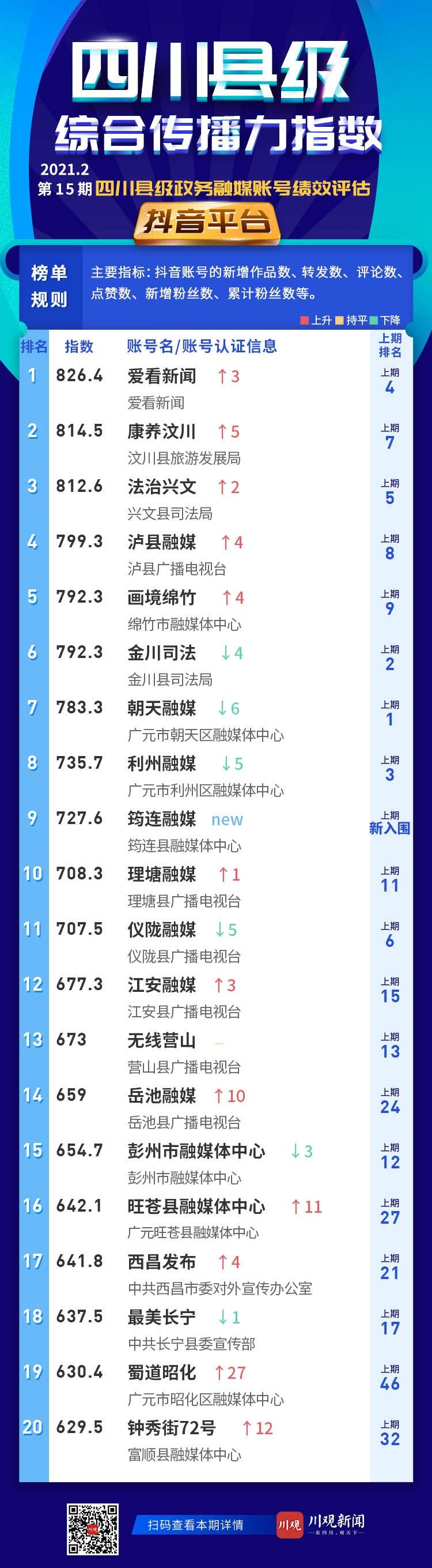 抖音平台前20名账号依次是:爱看新闻、康养汶川、法治兴文、泸县融媒、画境绵竹、金川司法、朝天融媒、利州融媒、筠连融媒、理塘融媒、仪陇融媒、江安融媒、无线营山、岳池融媒、彭州市融媒体中心、旺苍县融媒体中心、西昌发布、最美长宁、蜀道昭化、钟秀街72号。