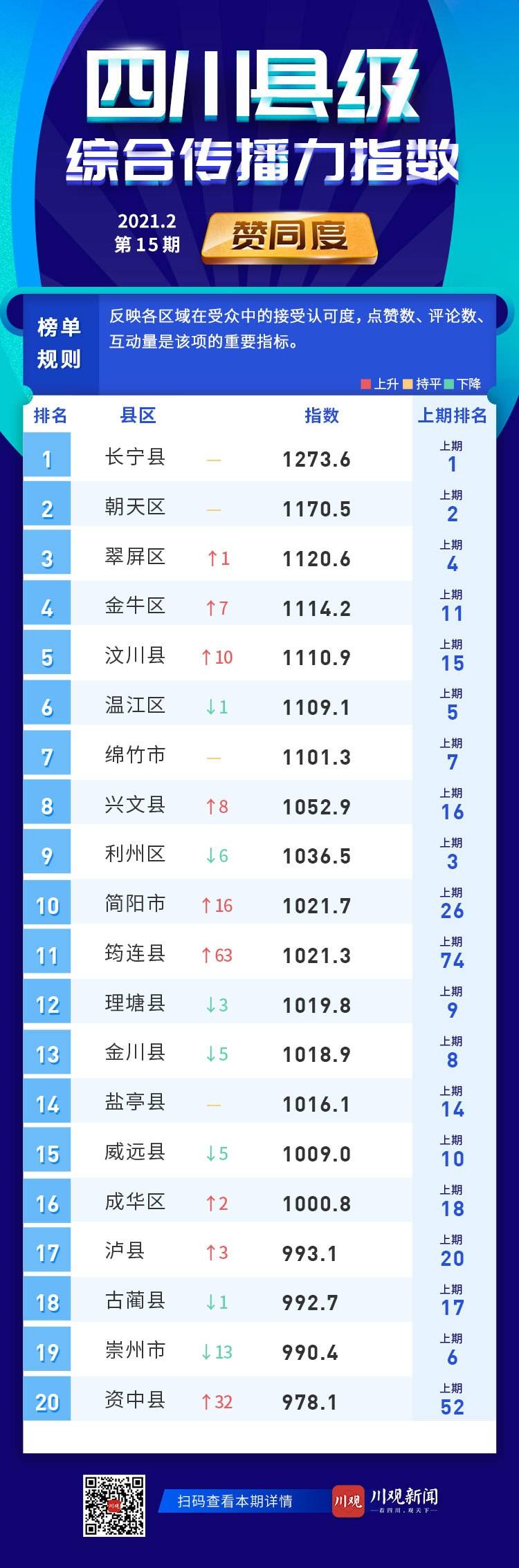 从赞同度前20名统计结果看,宜宾市长宁县蝉联第一;宜宾市筠连县、内江市资中县、成都市简阳市排名上升幅度大。