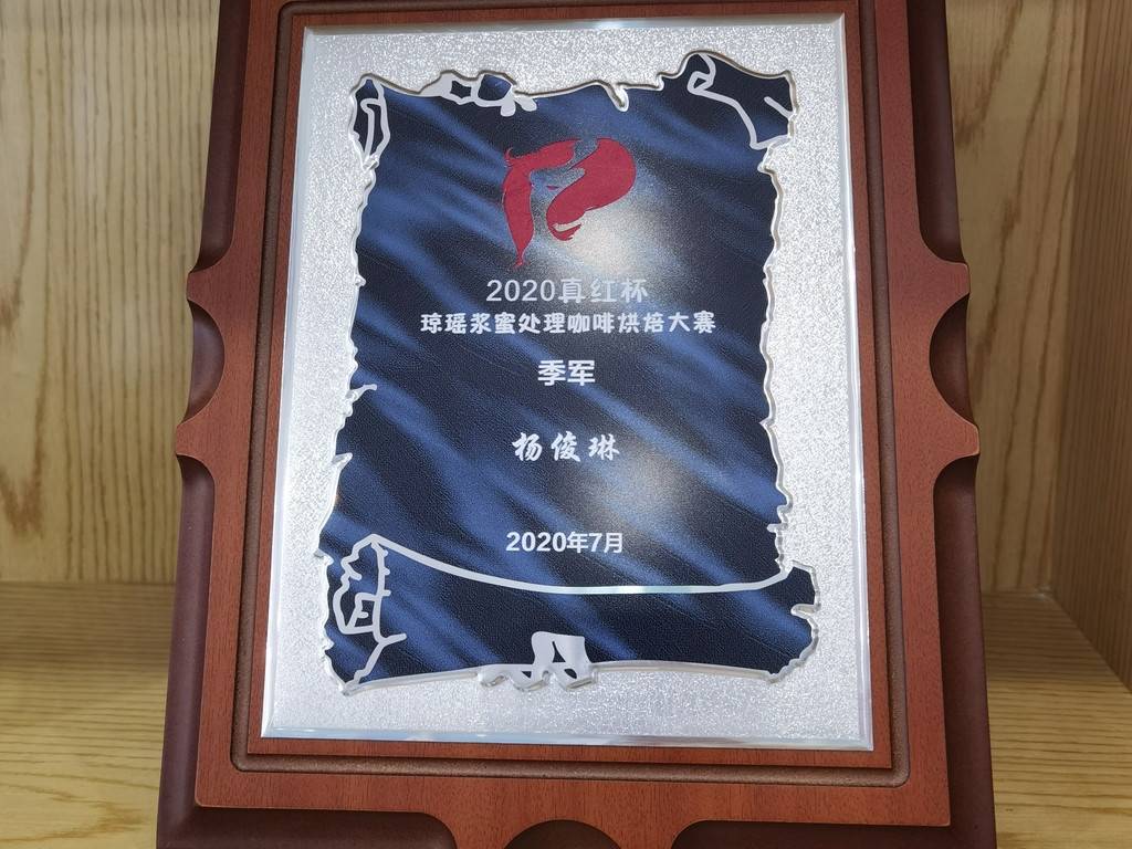 在顺城街分店内,一块写有“2020真红杯琼瑶浆蜜处理咖啡烘培大赛季军”字样的奖牌,被放在书架上一个毫不起眼的角落处。