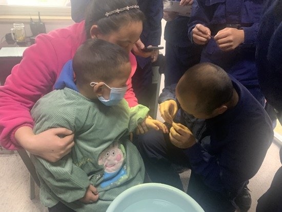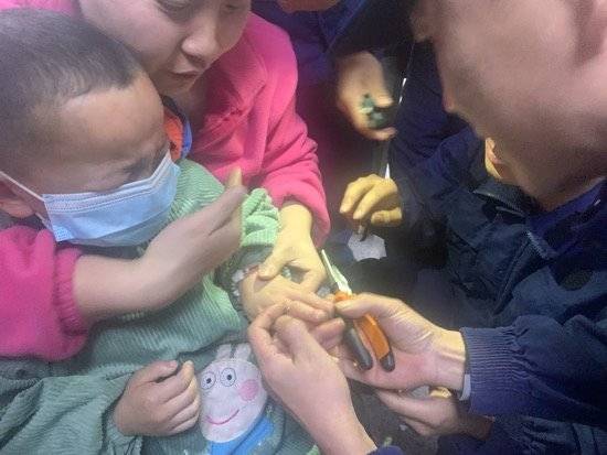 接到电话后,大队便派有经验的消防队员准备救助工具守在营区大门,等待小孩的到来。来到营区后,小孩一见到剪子、锯子、老虎钳这些坚硬的工具就啼哭不止,这可为难消防员们,简单的救援也变得棘手起来。在场的人只好使出浑身解数想法子逗他,随后端来冰水将其小手进行冷敷,缓解手部红肿,待小孩情绪稳定后,救助队员立即对其小手进行保护,用小型液压钳进行切割,不一会,铁环切开了一个口子,两名队员齐心合力,轻轻用尖嘴钳将铁环夹断慢慢摘下。