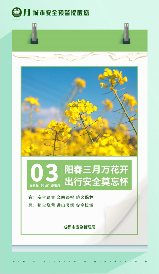 随着春意渐盛,近日踏青游玩的市民明显增加。成都市应急管理局提醒市民要注意做好古镇古街、农家乐、亲子田园等景区景点安全风险防范,做好游客运载工具、各类游乐设施的安全风险防范。