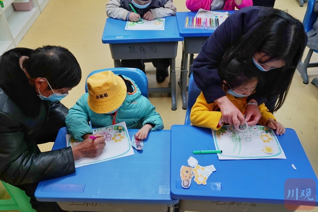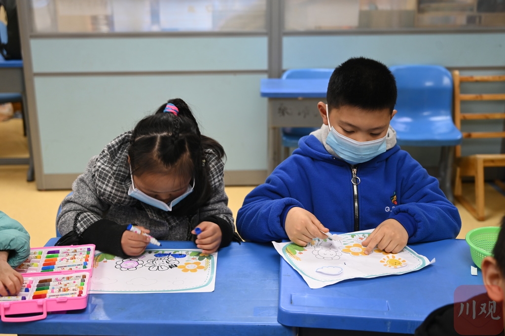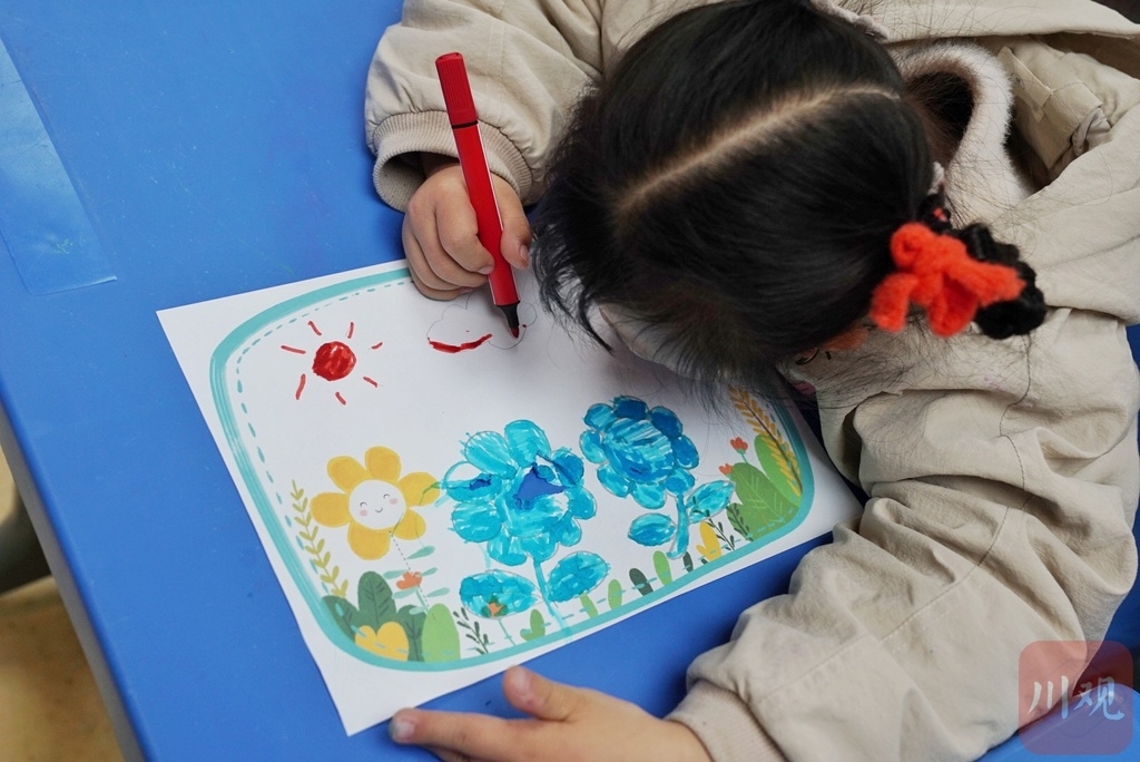 “哇,我的树树花花好好看。”不到一节课的时间孩子们纷纷作画完毕。记者看到,一朵朵小花一棵棵小树跃然纸上,充满童趣,孩子们拿着自己的作品争着向李老师要“好评”。