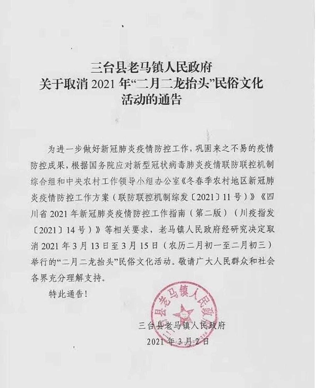 3月11日,四川在线记者从绵阳市三台县老马镇政府获悉,为扎实做好新冠肺炎疫情防控工作,切断传播途径,保障人民生命安全和身体健康,决定取消2021年3月13日至3月15日(农历二月初一至二月初三)举行的“二月二龙抬头”民俗文化活动。