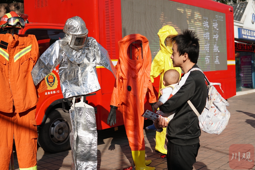 文字、视频宣传还不够。在现场,消防指战员向市民介绍各类防灭火装备,让市民近距离、直观地了解各种消防设备,学习消防安全知识。