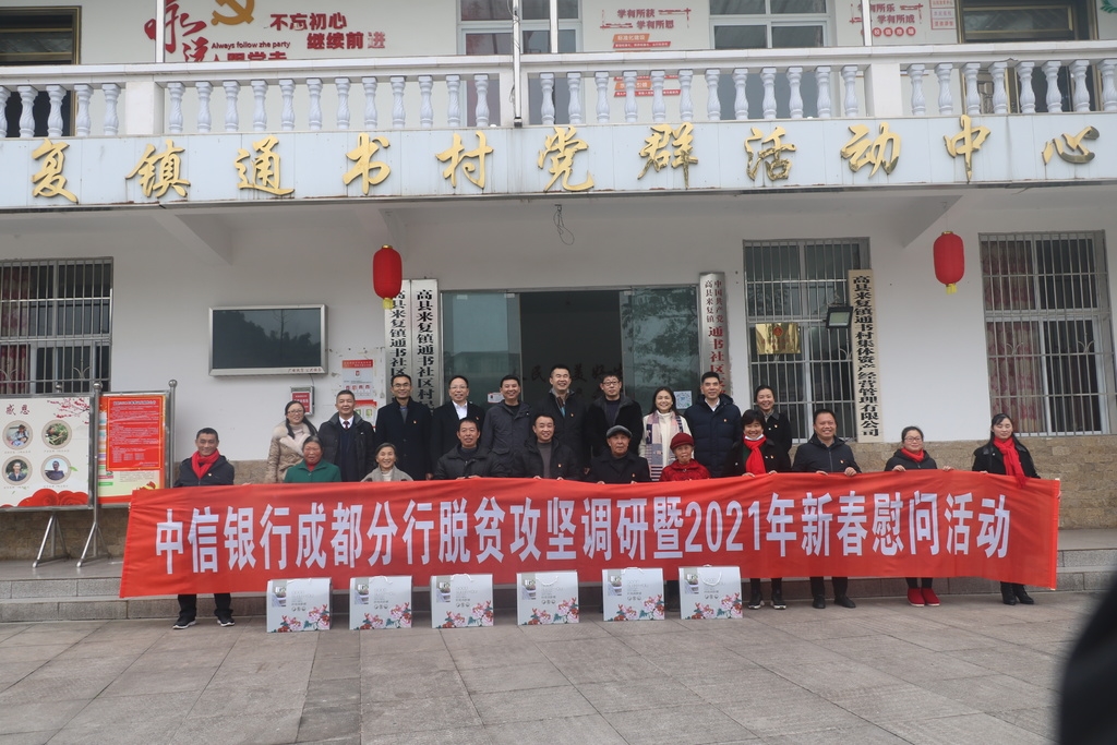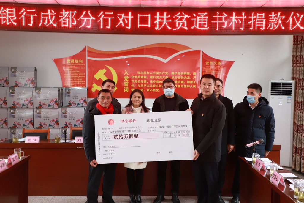 2020年年底,中信银行成都分行党委书记、行长沈强、专员刘静再次率队赴通书村开展党建结对共建活动,联合开展义务植树、访贫问苦、爱心送教等主题党日活动。此外,中信银行还送去了20万元捐赠款用于改善村基础设施,现场与通书村集体公司签订40余万元的农产品采购合同。