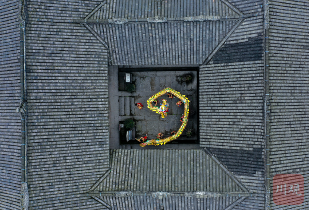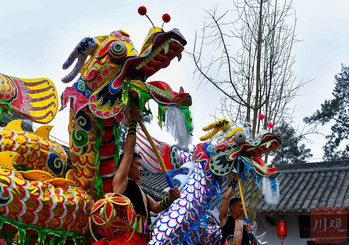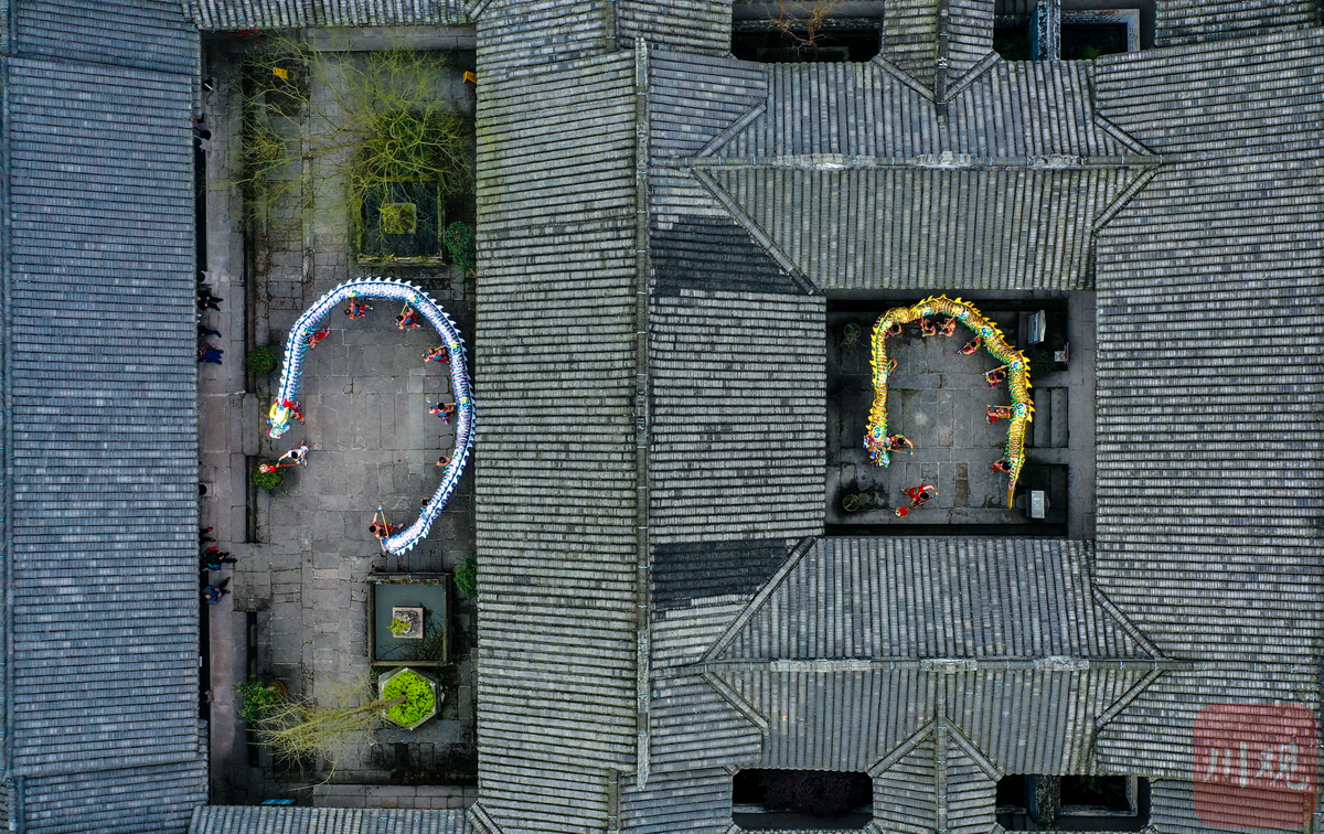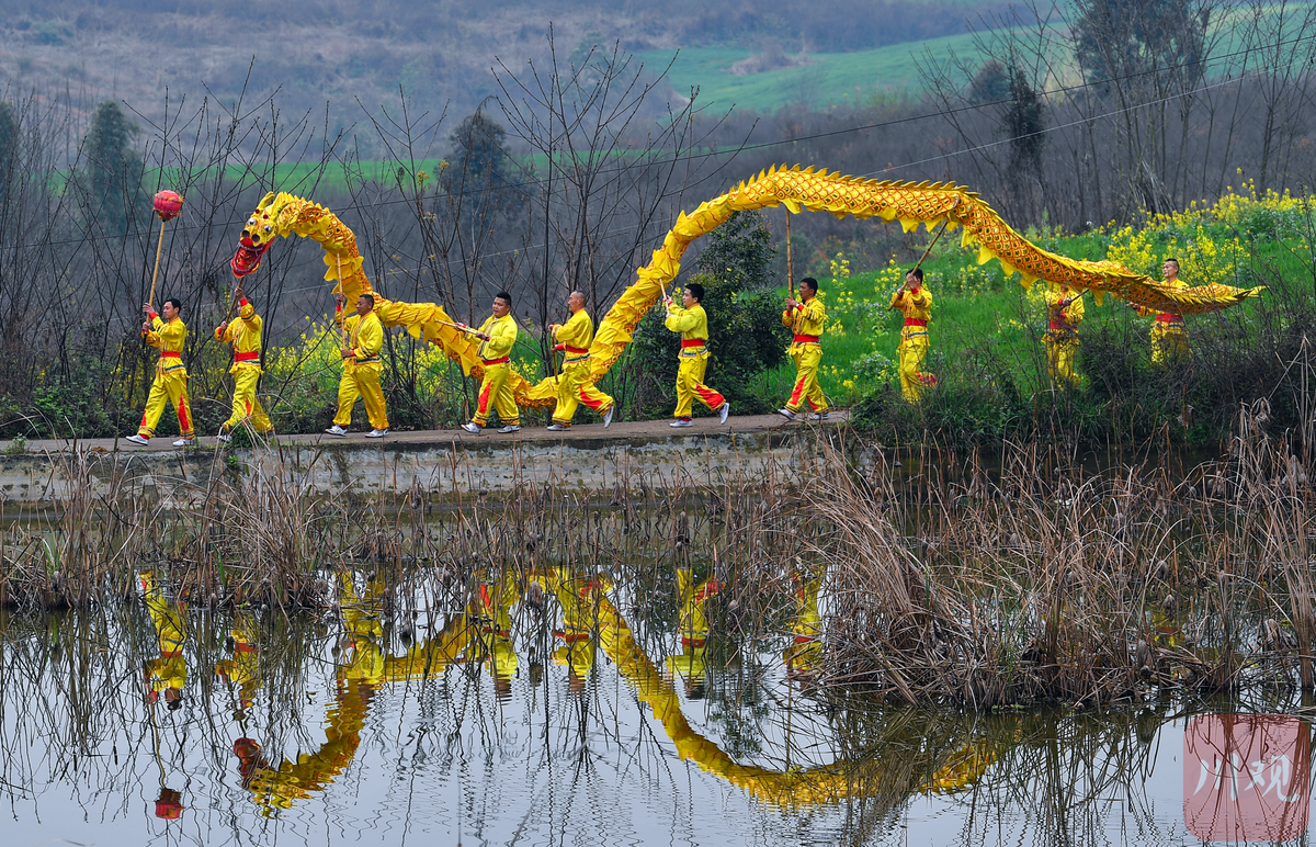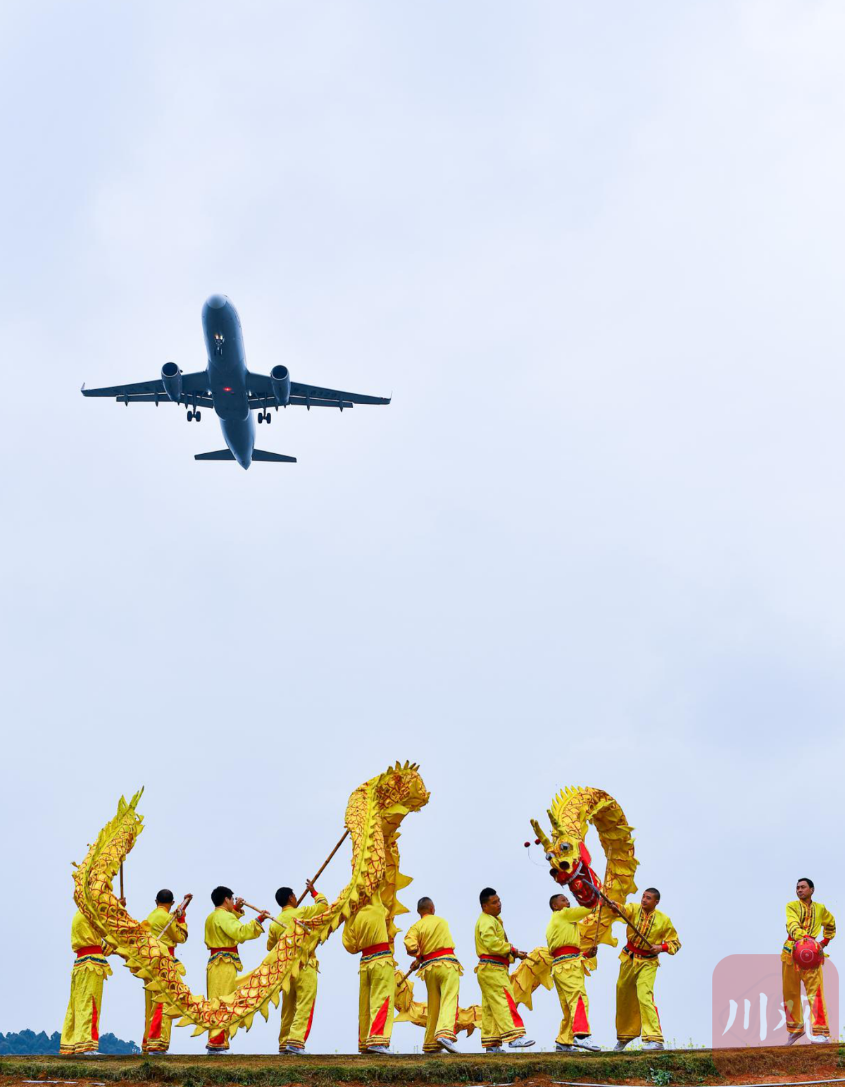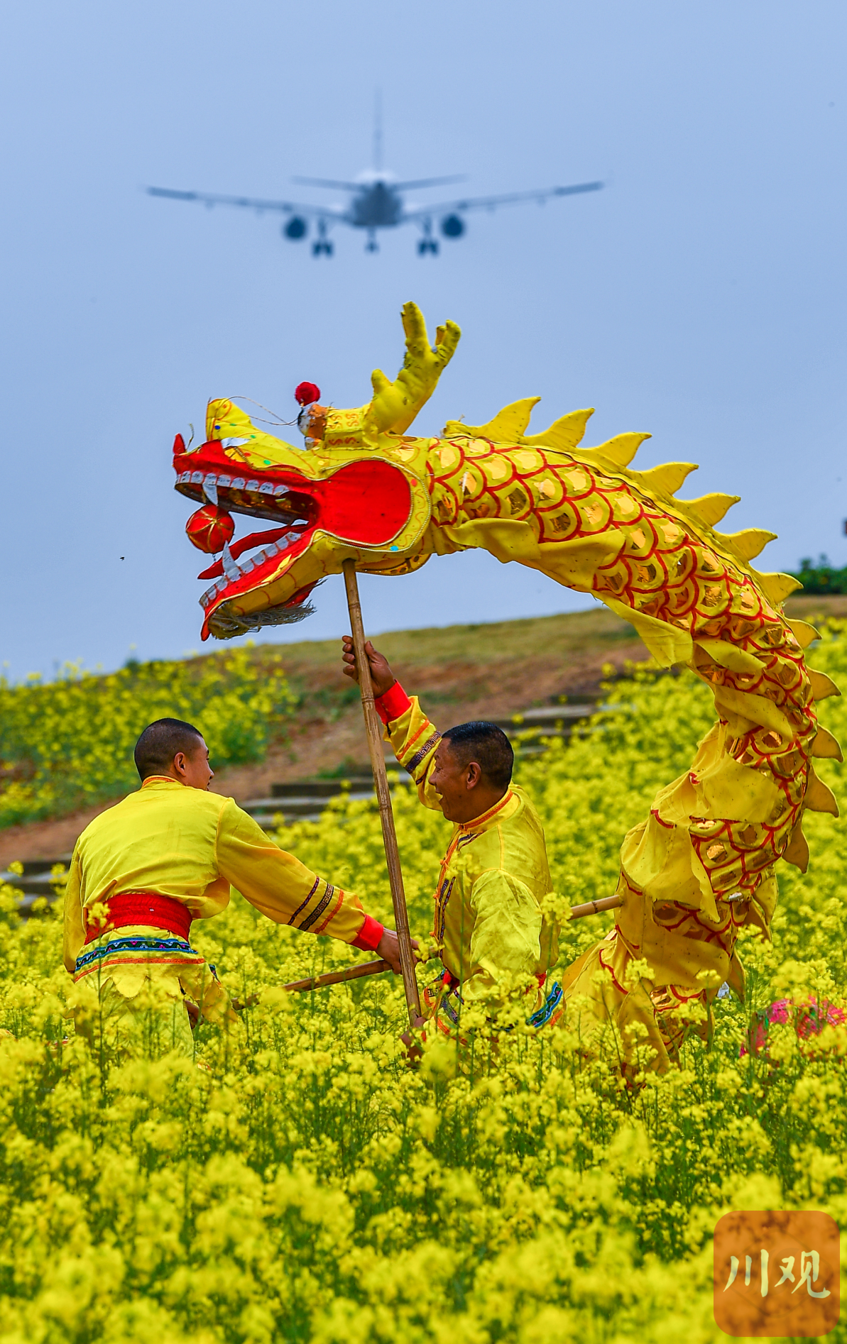 在成都市双流区黄甲街道金色的油菜花地中,黄龙溪火龙灯舞起来,在空港花田中飞机从飞舞的火龙灯上飞过,成为了空港新风景;在在泸州市泸县的屈氏庄园里,两条雨坛彩龙舞了起来。它们在舞龙人的舞动奔走下,变得活灵活现……