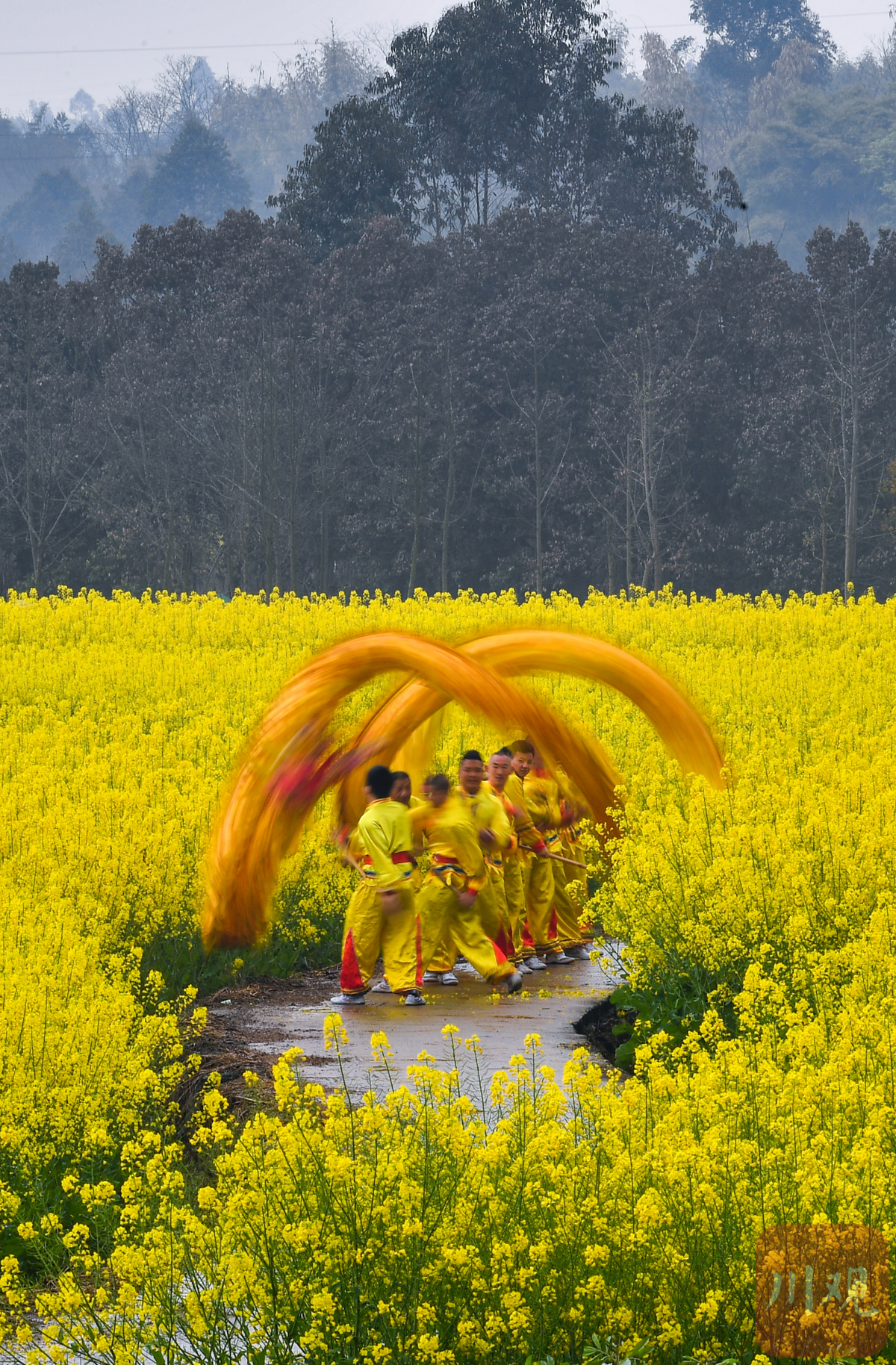 成都双流区的黄龙溪火龙灯在油菜花地中舞起来