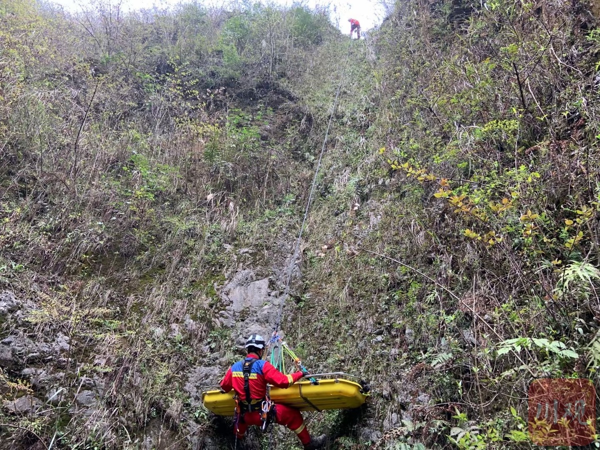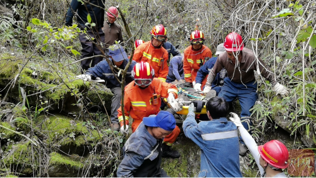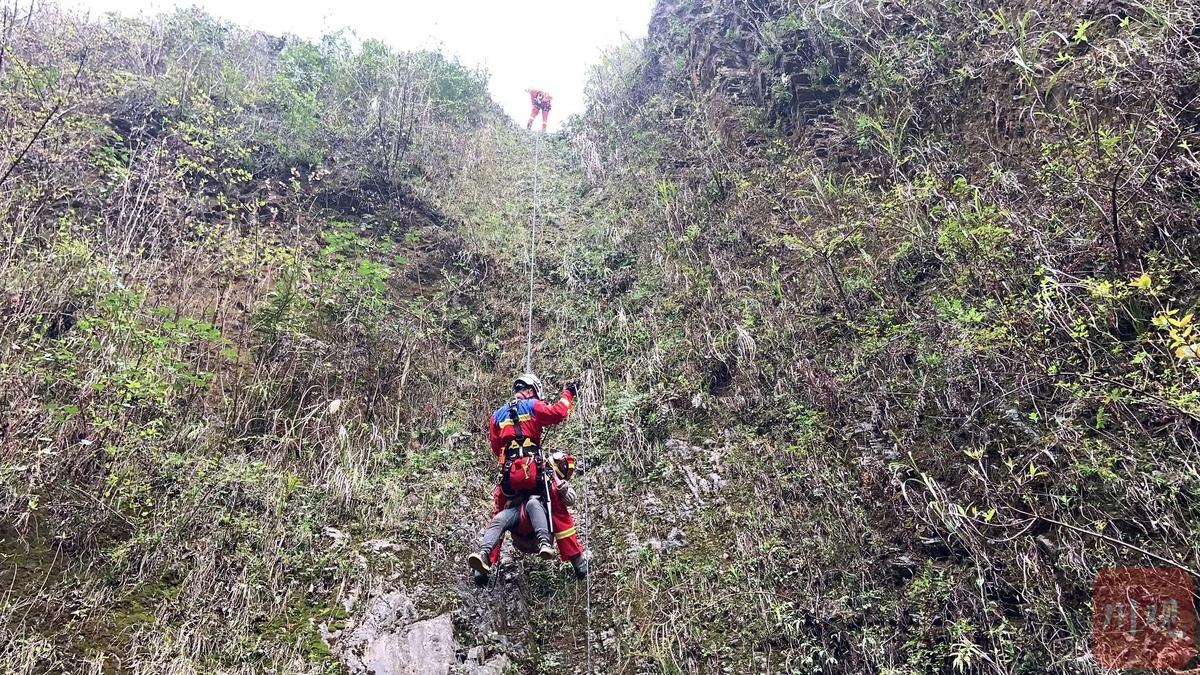 徒步行进2公里,攀登到约1200米海拔高度后,救援人员在一个约85度斜坡、深度约40米的山谷中发现被困人员,迅速搭建绳索救援系统,实施营救。