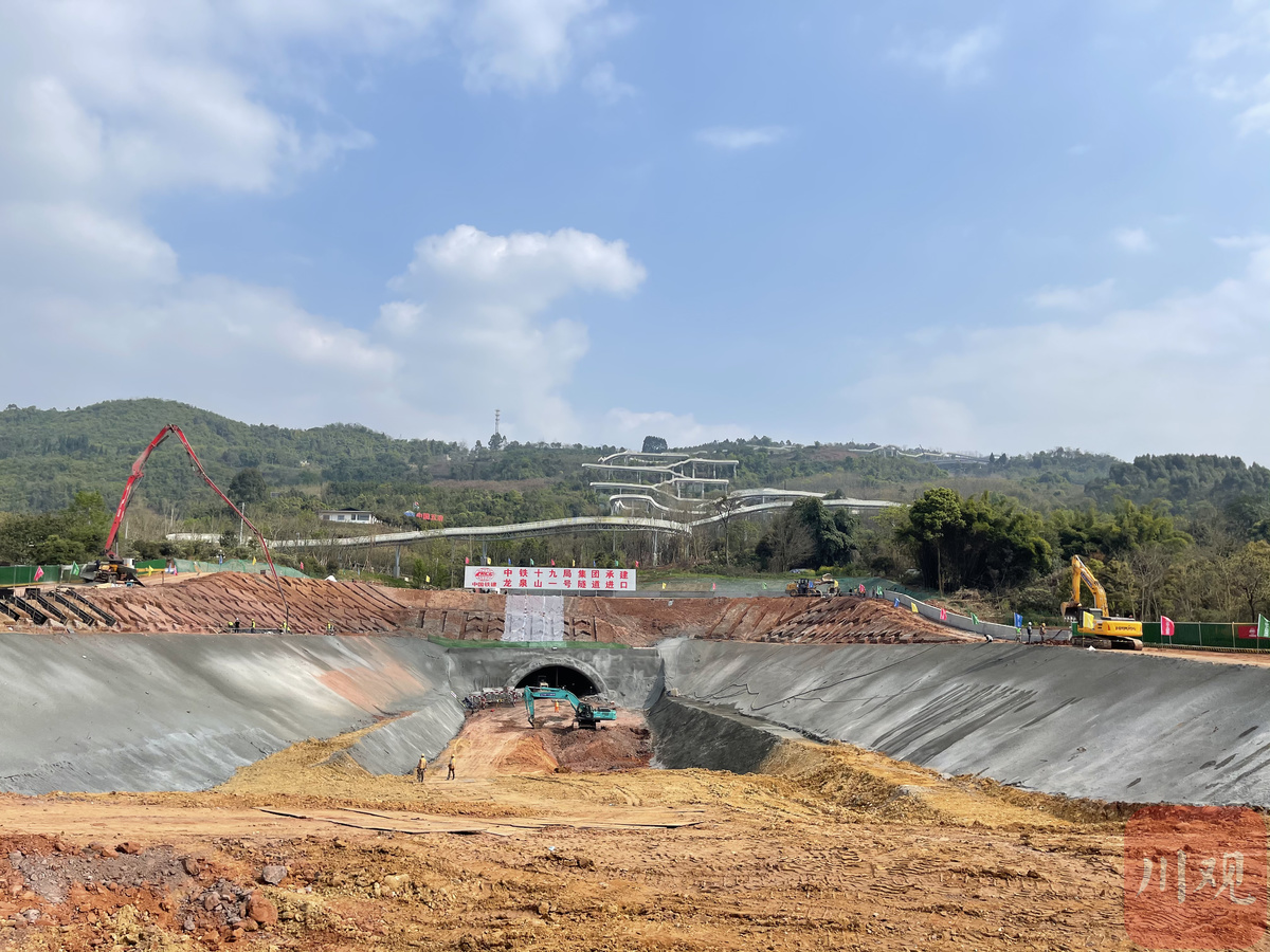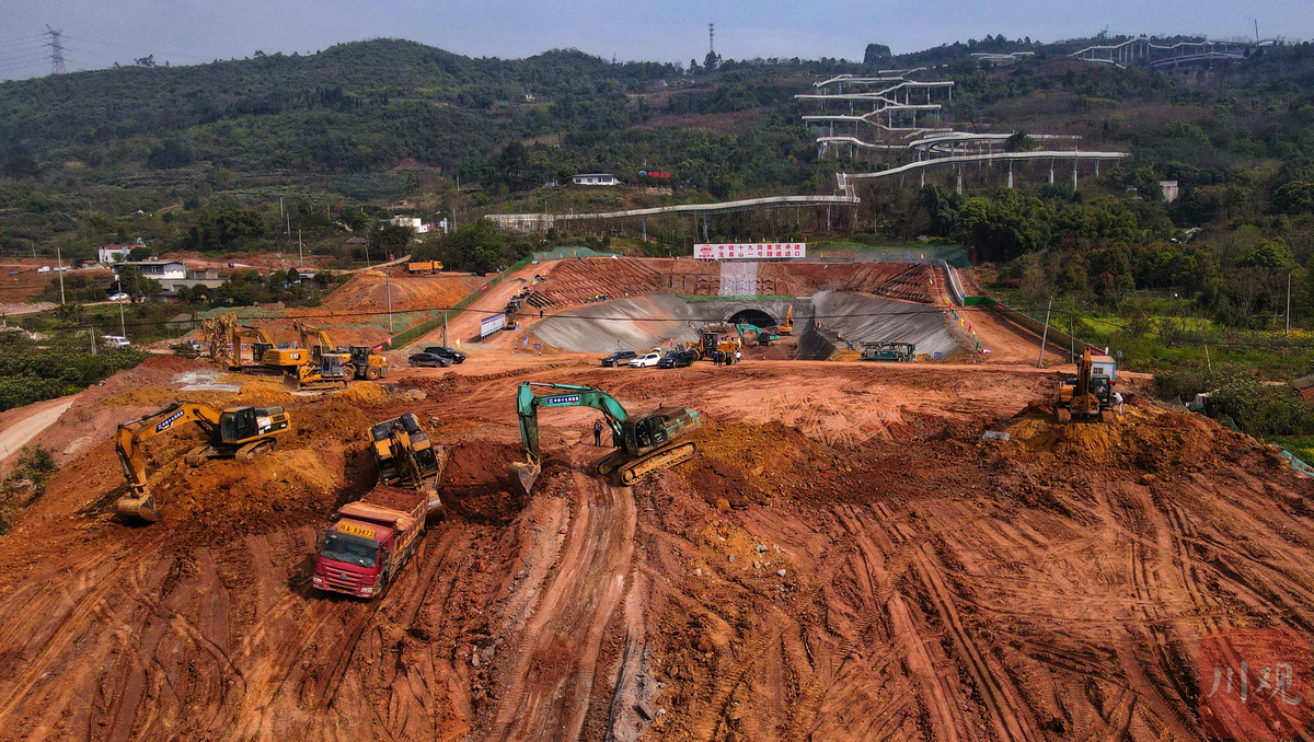 四川在线记者在龙泉山一号隧道进口端看到,隧道进口已经支撑成型,洞内不时机械施工声,几台挖掘机聚集在洞口进行挖掘作业;从进口端往天府站方向的数百米工地,已经挖出一个巨大的坑,现场机器轰鸣,洞口处两侧边坡正在进行混凝土浇筑的施工准备,离隧道口稍远的地面,挖掘机、运渣车配合作业,忙碌而有序。施工人员介绍,隧道进口端为一个开阔的明洞,待高铁路基完成后将进行回填,目前进口处的路基已挖掘1/3,进洞施工后,挖掘进度将加快。