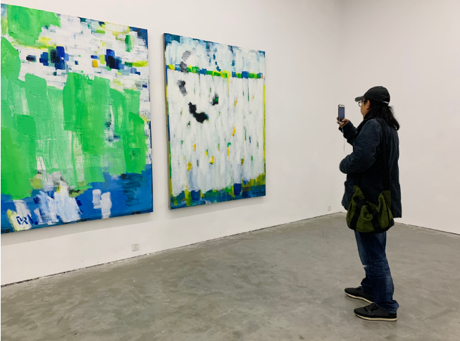 循着展厅望去,目光便骤然间被一汪森林绿捕捉住,这些作品中,不管是一棵树的图像变体,还是层层涂抹后剩余的痕迹,似乎每一幅绘画都残留着眼睛一样的圆圈形,将诧异与好奇迎向观众。在一幅名为《无题(客人)》的作品面前,不少观众停下了脚步。仔细看去,底稿仍是异形体的树林,但在底稿之上,王俊用黄色和白色颜料进行了遮挡和覆盖。据介绍,王俊并不满足于直接或简单地对图像进行转译,而是尝试通过不断的否定、覆盖、重建去靠近一种感知的真实。