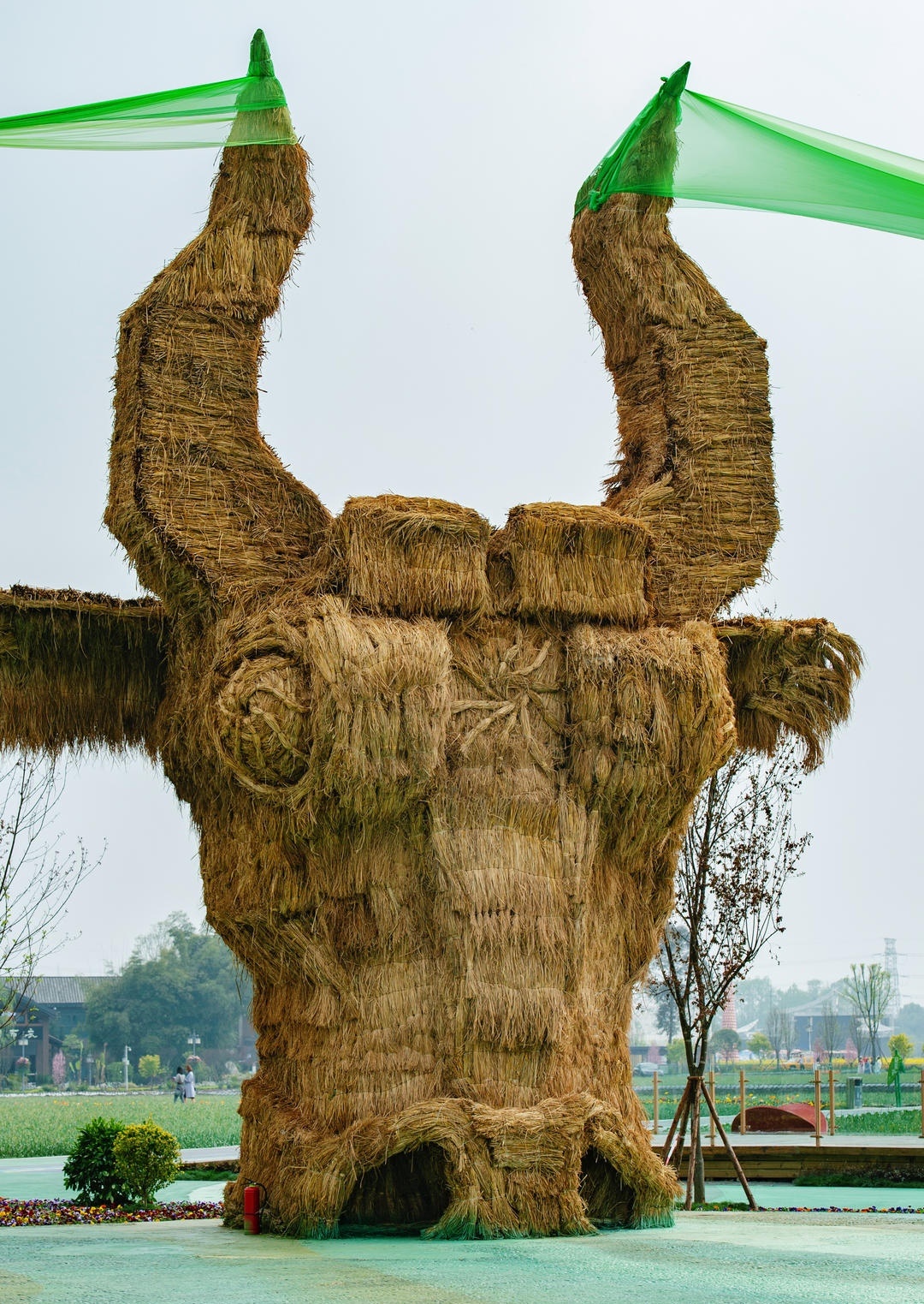 这些引得游客纷纷打卡拍照的艺术装置,大有来头。设置在主会场入口处的,是一幅用稻草为原料创作的作品《牛》,为中国当代艺术协会副主席严永明创作,之所以选择农耕文化中最具代表性的“牛”进行艺术创作,也是为了弘扬“三牛精神”。