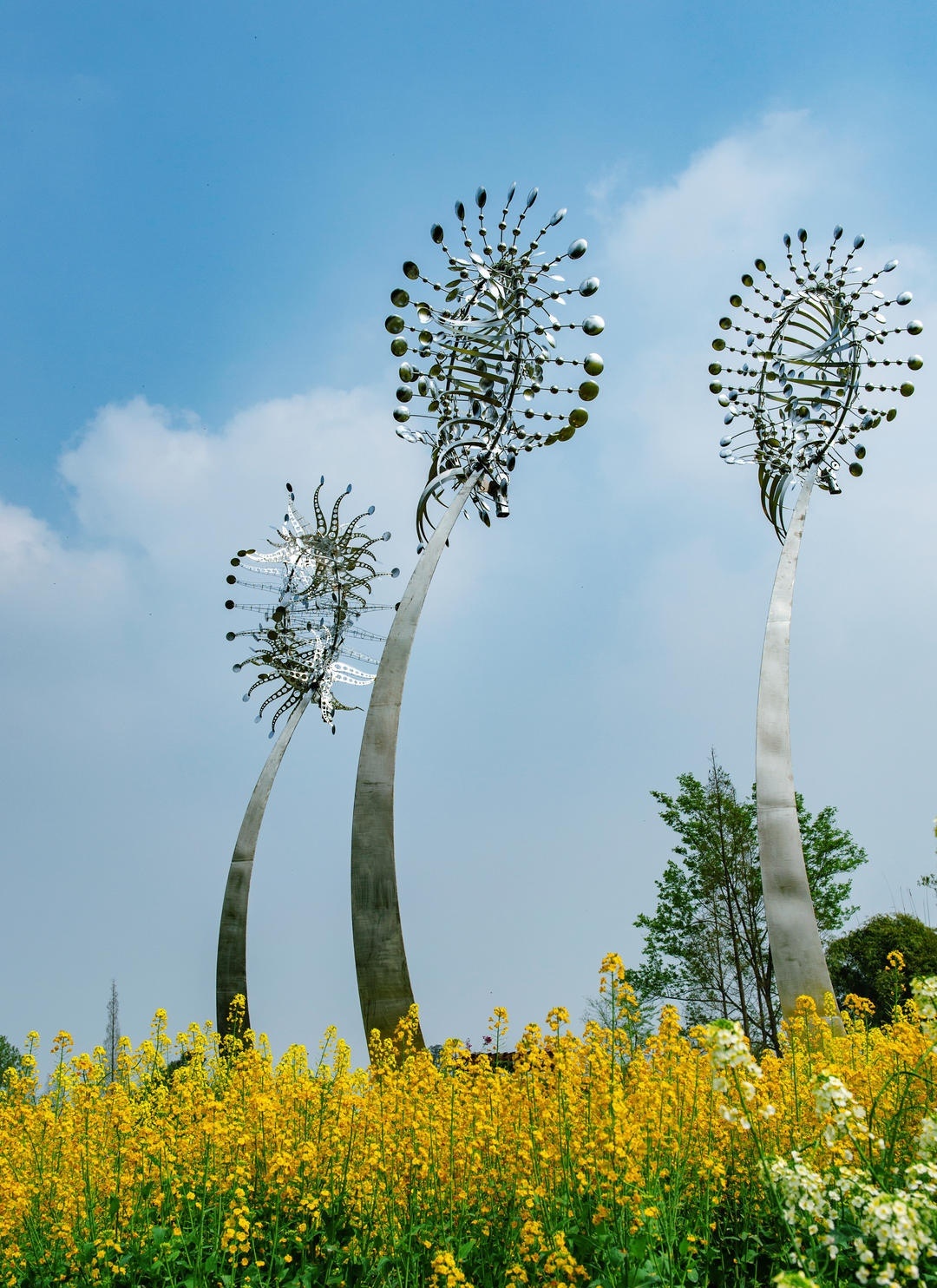 往里走,还有更多精彩:韩国公共艺术家赵星太设计的《生命之井》,用反光镜、反射镜等打造装置艺术,创造无限之幻境,表达生生不息的生命力;保加利亚国际著名公共艺术家彼得·罗夫设计的《种子的荣耀》,以抽象化的种子为创作元素,表象种子生命的脉动,寓意乡村振兴的种子在天府大地上生根发芽……