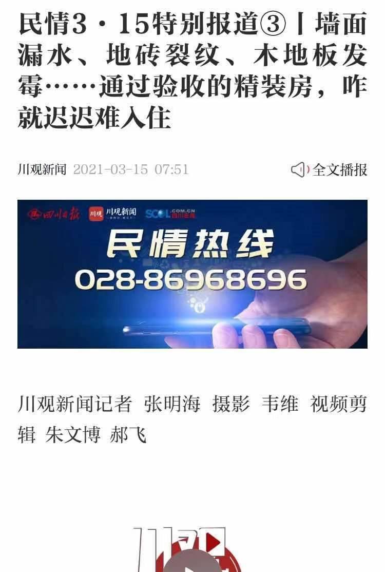 3月15日,四川在线民情热线以《墙面漏水、地砖裂纹、木地板发霉……通过验收的精装房 咋就迟迟难入住》为题,对部分精装房存在的货不对板、质价不符等问题进行了深入报道。多家媒体平台对此进行了转发并引发热议,四川日报全媒体问政四川平台和民情热线(028-86968696)接到多条关于精装房问题的留言或来电。