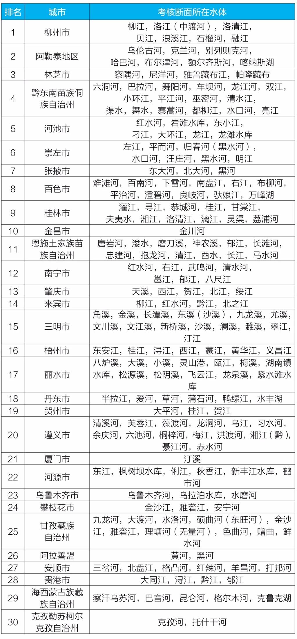 通报显示,2021年1-2月,全国地级及以上城市中,柳州、阿勒泰地区和林芝市等30个城市国家地表水考核断面水环境质量相对较好(从第1名至第30名),吕梁、濮阳和呼和浩特市等30个城市国家地表水考核断面水环境质量相对较差(从倒数第1名至倒数第30名)。