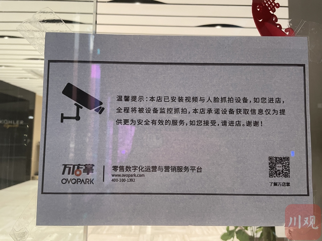 记者来到洗面桥街的科勒卫浴旗舰店,店内印有同样的“万店掌“商标的告示,该店店员告诉记者,这家旗舰店确实在店门口安装过人脸识别摄像头,但今天已经接到总部通知拆除了,对于记者询问安装这个摄像头的作用是什么时,店员表示并不清楚。