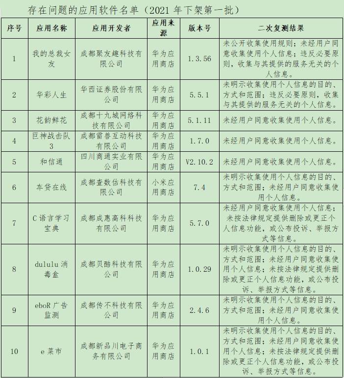 日前,省通信管理局发现部分移动应用软件“隐私政策中未清晰说明收集个人信息目的、类型、方式”、“未征得用户同意,私自收集个人信息或打开可收集个人信息权限”、“未提供个人信息安全投诉、举报渠道”等3类问题较为突出,其中10款APP经二次复测仍未按要求完成整改,依据《网络安全法》和《移动智能终端应用软件预置和分发管理暂行规定》(工信部信管〔2016〕407号)等法律法规,省通信管理局对以上10款APP进行了下架处理。