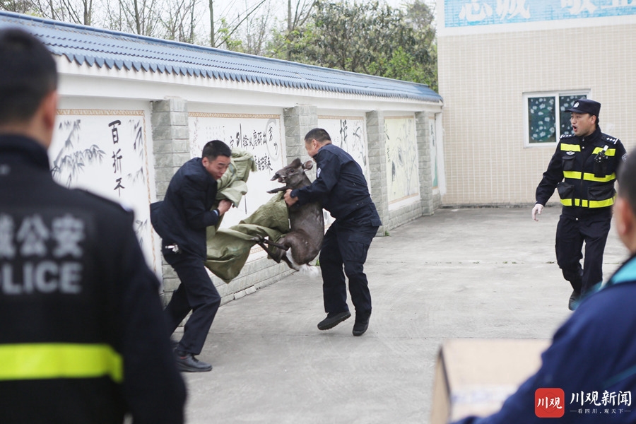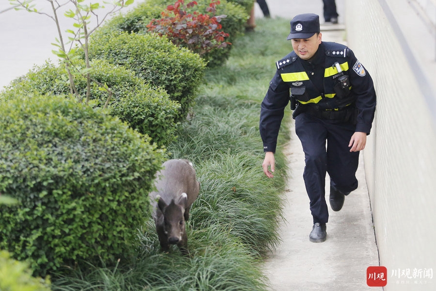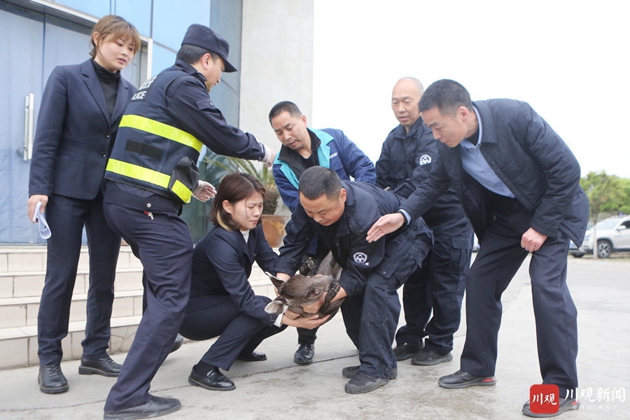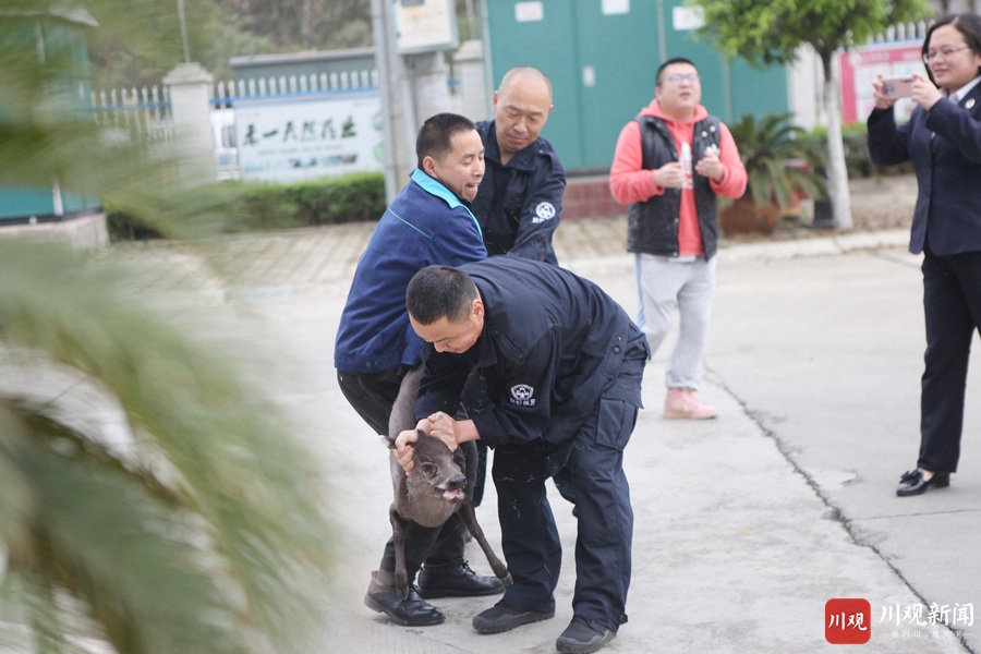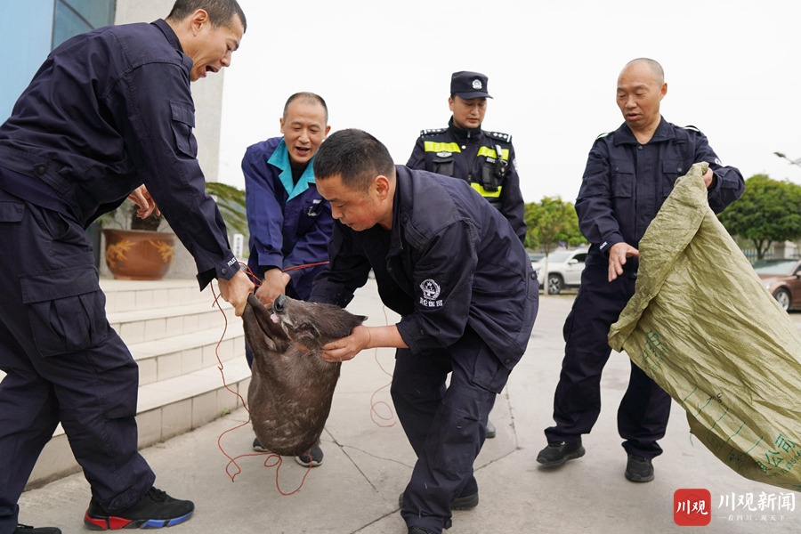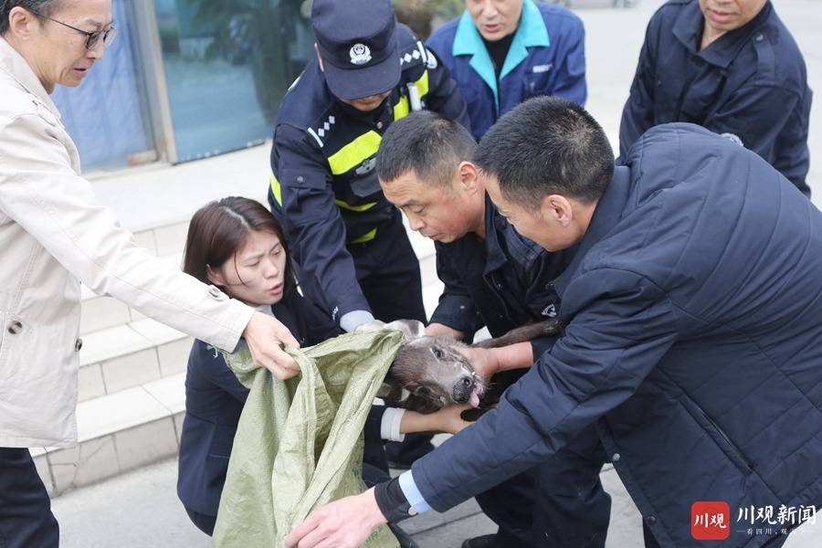2021年3月17日早上8点20左右,绵阳市范家村科伦医贸院内来了一头下山“怪兽”,石塘派出所民警高映和队员们接警后赶到现场,联合院内的安保人员等共十余人对这头迷路的“怪兽”进行救助。目前,已将其送至动物园检查护理。