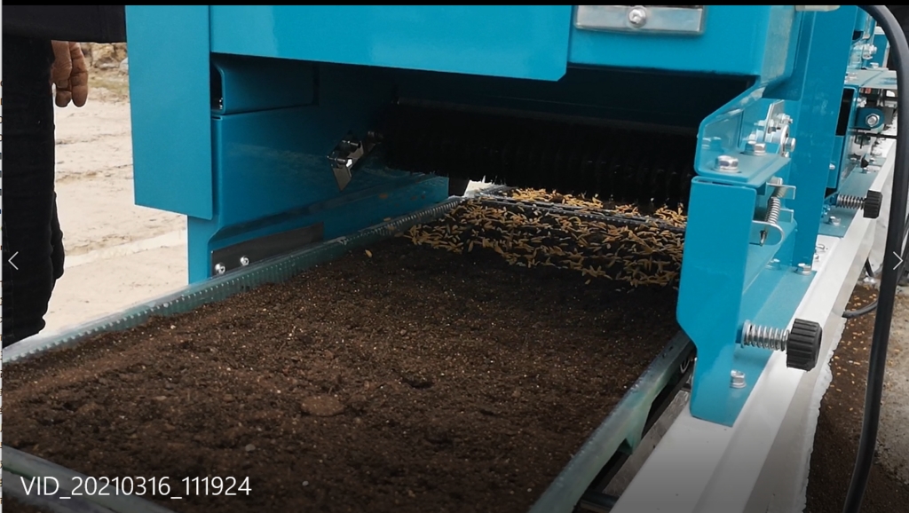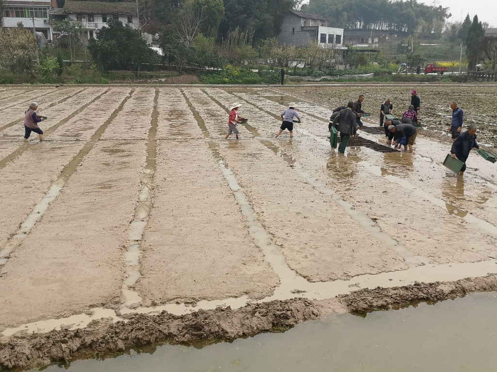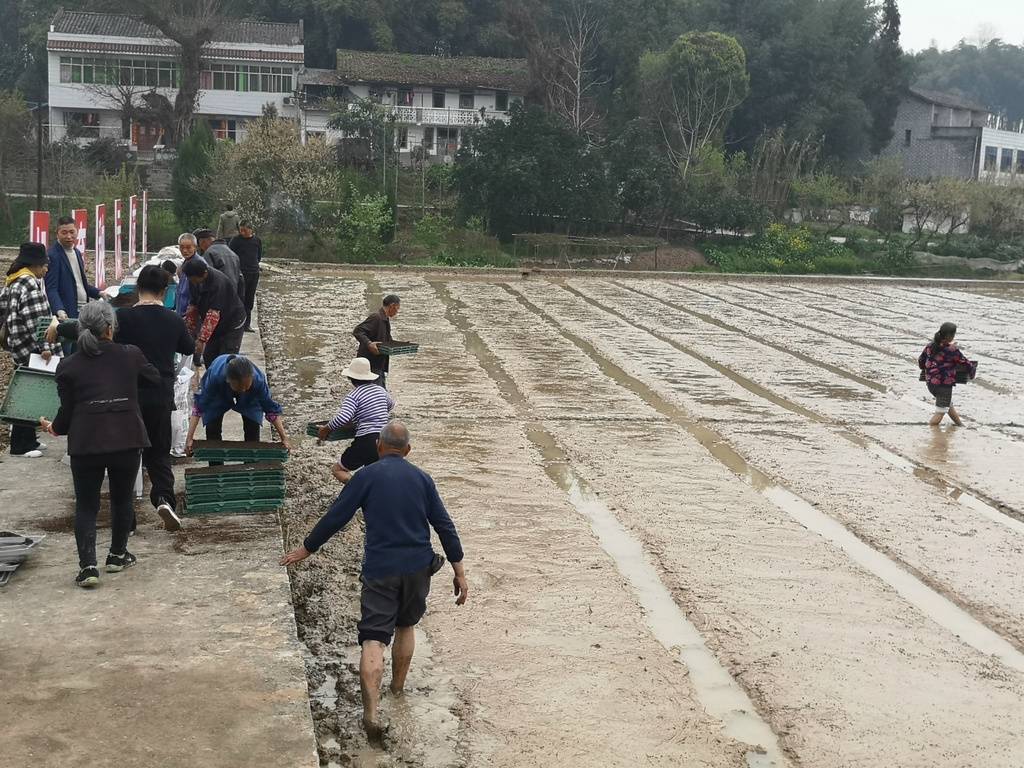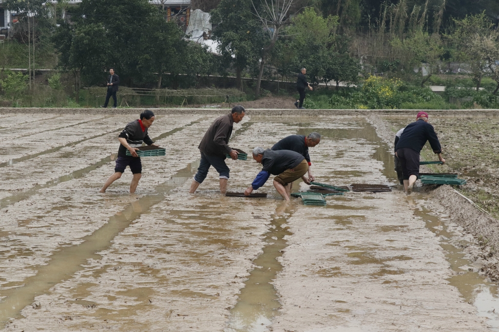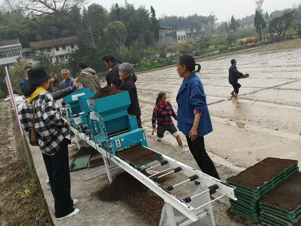 当天上午,在大竹县月华镇大春生产示范点,田坎上育秧播种机旁围着多位农民,一人把育秧盘放进传送带上,依次经过铺撒营养土、均匀撒谷种、再撒一层营养土,一盘盘制备好的秧盘“出炉”,随后农民端着它们整齐地放置到秧田苗床上。