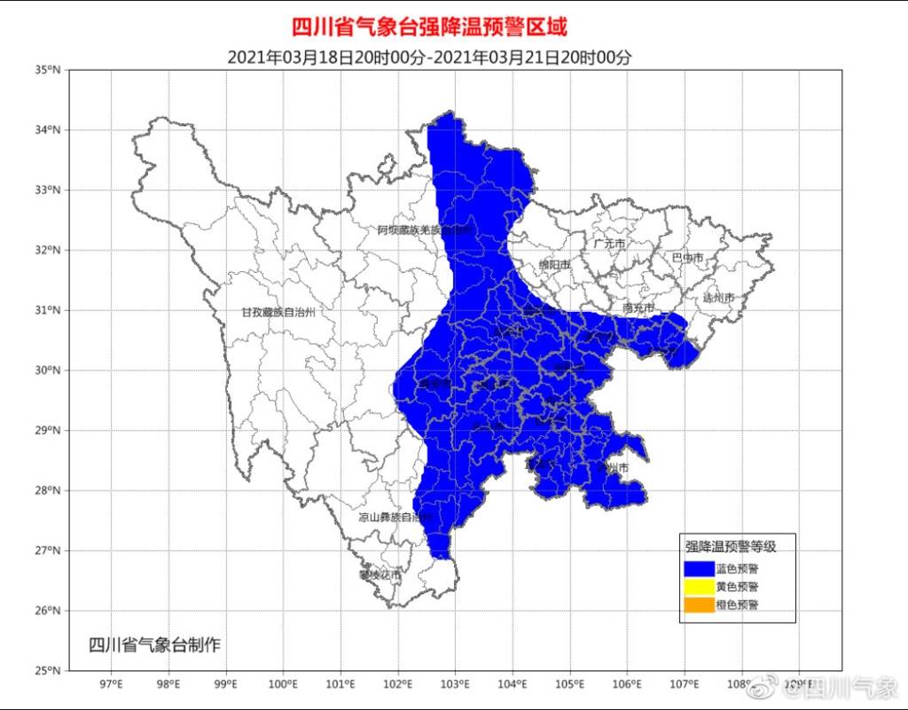 四川省气象台3月18日16时发布强降温蓝色预警:预计,受北方冷空气和高原低槽的共同影响,19~21日我省有一次降温降水天气过程,其中德阳、成都、雅安、乐山、眉山、遂宁、广安、资阳、内江、自贡、宜宾、泸州12市及南充南部、阿坝州东部北部、凉山州东部日平均气温将累计下降7~9℃,盆地南部局部地方超过10℃;盆地大部有小雨,南部有中雨;19日午后到晚上盆地北部部分地方有4~6级偏北风,山口河谷地区可达7级;阿坝州东部北部、凉山州东部有小雨(雪),局部中到大雪。