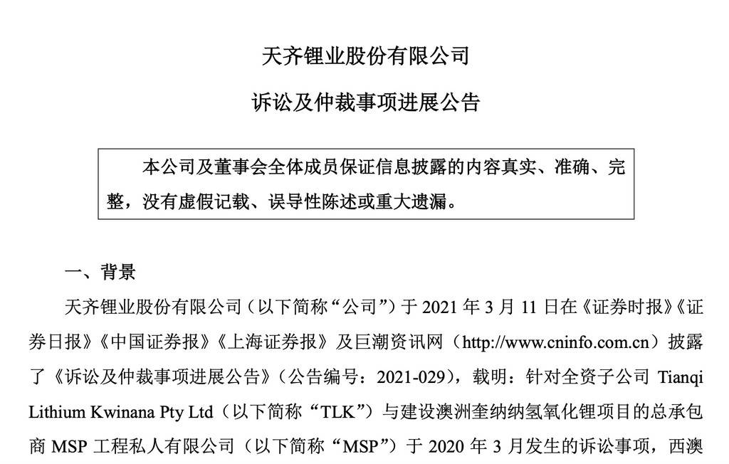 天齐锂业当时表示,3月初收到传票后,TLK认为MSP违反了双方签署的《总包协议》中关于工程完成时间和预算的约定,造成公司在澳洲奎纳纳的氢氧化锂项目建设严重超期、超支,因此,TLK不应支付MSP所要求的工程款项。