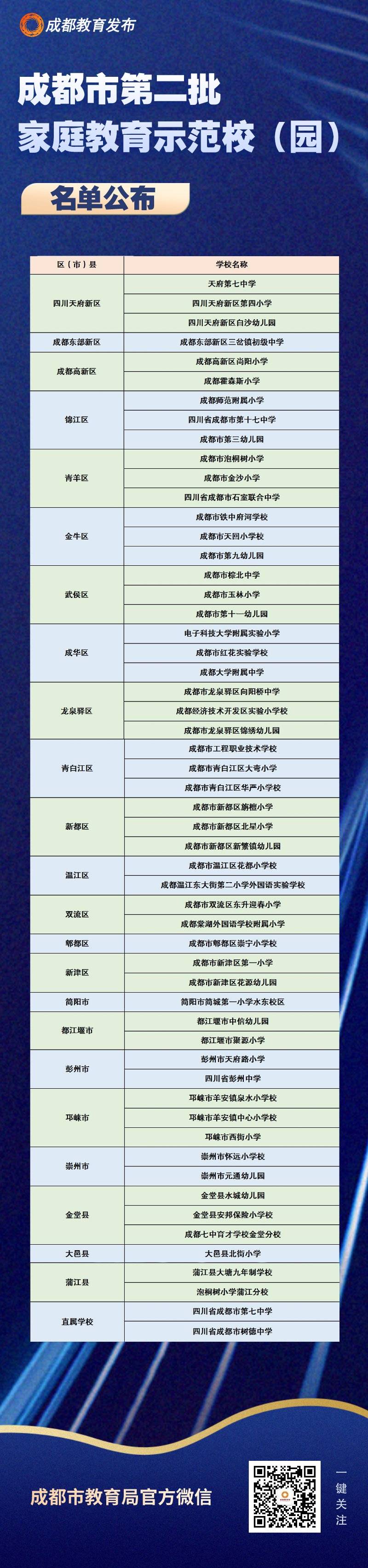 记者3月18日从成都市教育局获悉,成都市第二批家庭教育示范校(园)出炉。所谓“家庭教育示范校(园)”即通过“三家”(家委会、家长学校、家长会)为家校共育载体,聚力家校互动的规范管理、家庭教育的科学研究、构筑家校社一体的教育合力,家庭教育工作具有一定成效和一定影响力,是区域内能发挥示范辐射和引领作用的学校。截至目前,成都市已评选出两批共106所学校为成都市家庭教育示范校。(名单附后)