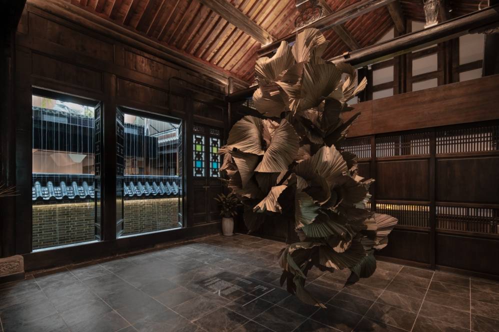 走进展厅,印入眼帘的是一个巨大的植物艺术装置,它表达着临邛古城因水而生的主题。