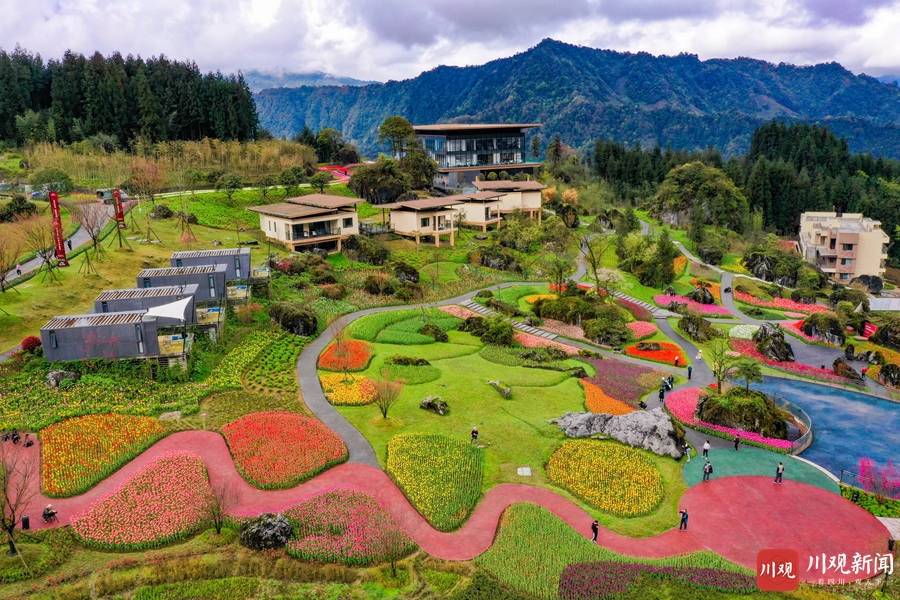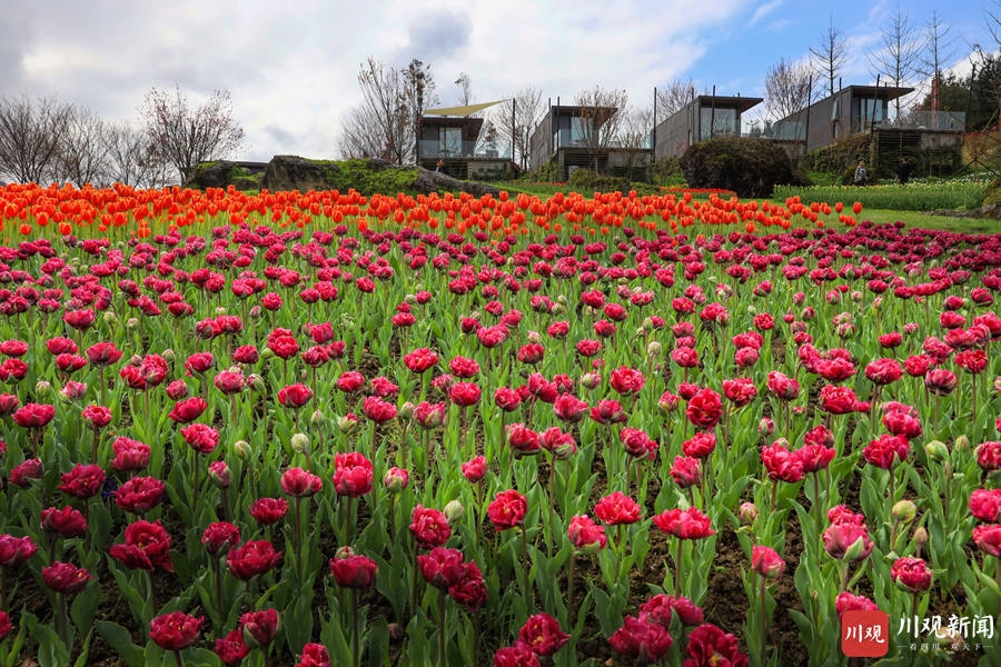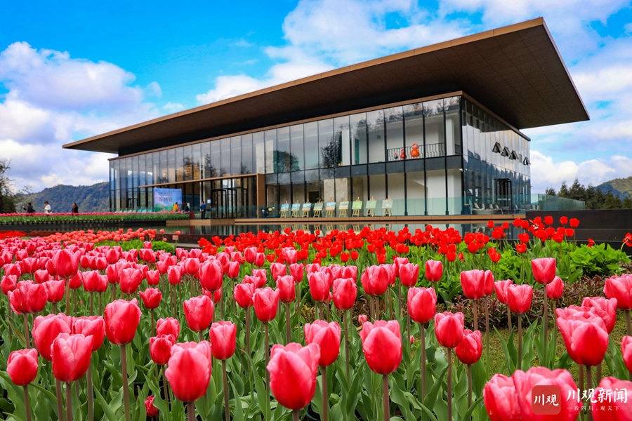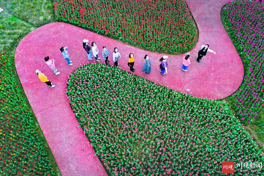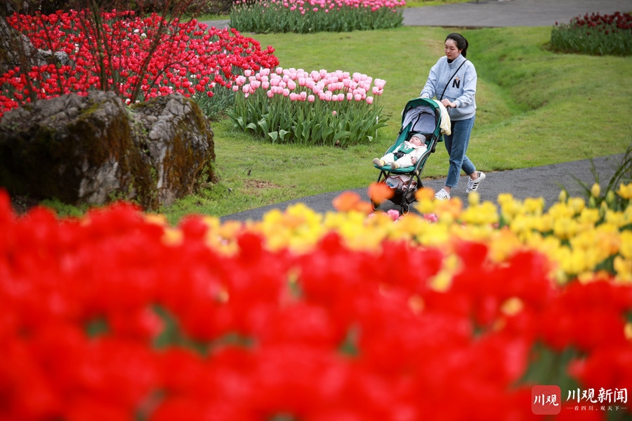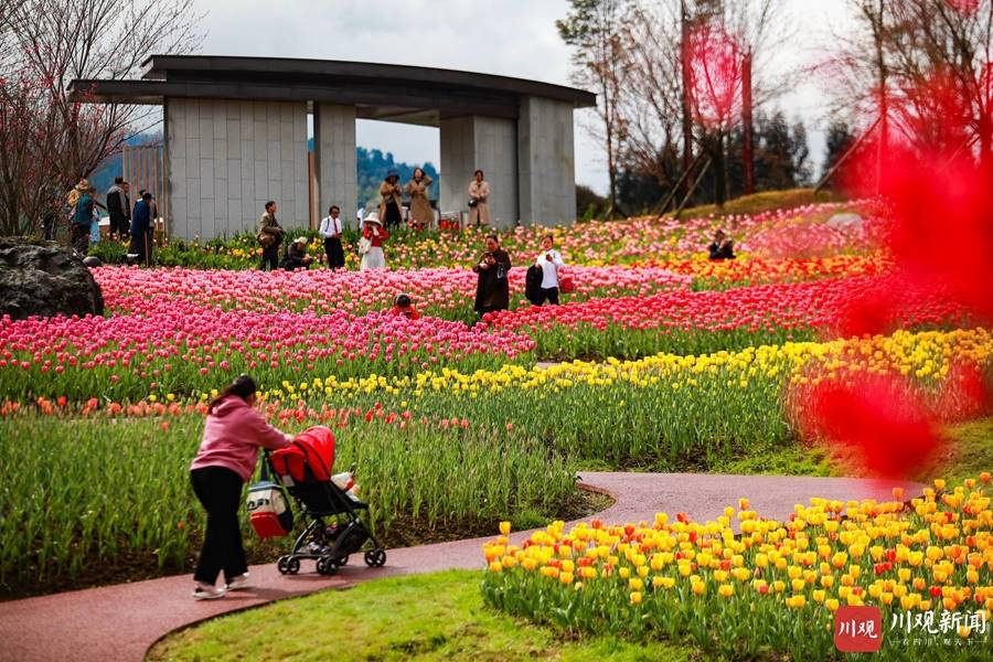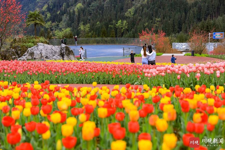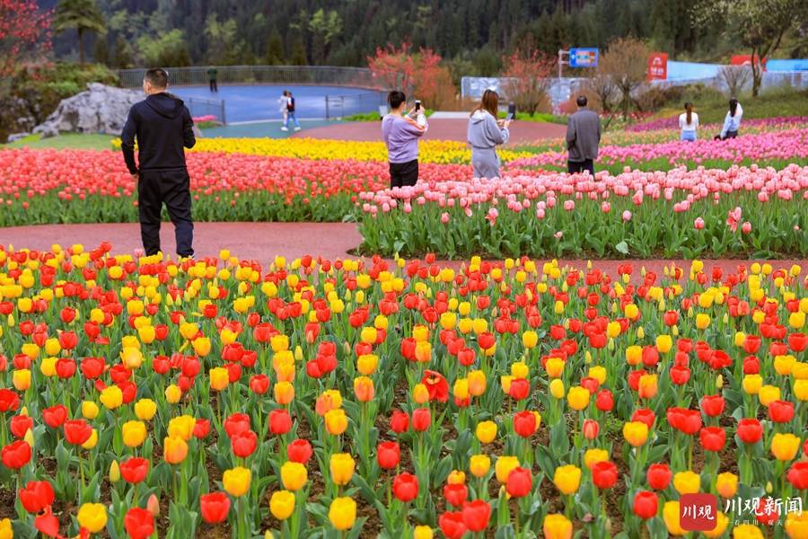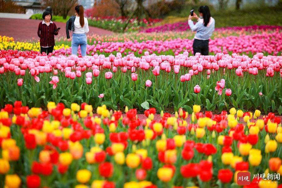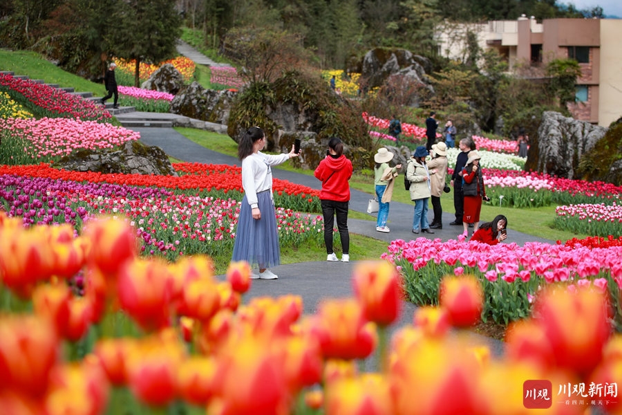 雅安荥经黑石公园内的30万余株郁金香竞相绽放,引得游客们纷纷用相机捕捉春色,共赏浪漫郁金香花海。