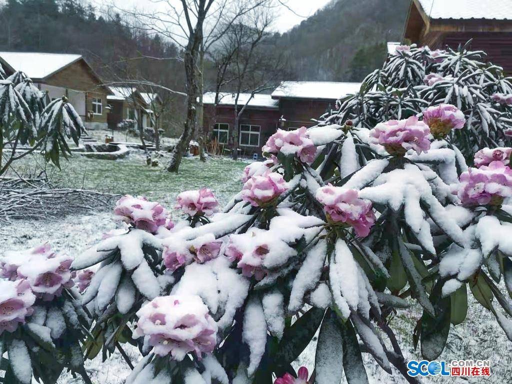 春分时节意味着莺飞草长、油菜花香,但是四川盆地却迎来了降温第一天。一大早,在川东北广元,朝天曾家山、旺苍鼓城山都迎来了降雪。簌簌落下的雪花与盛开的高山杜鹃相遇,漫山遍野,白里映红。