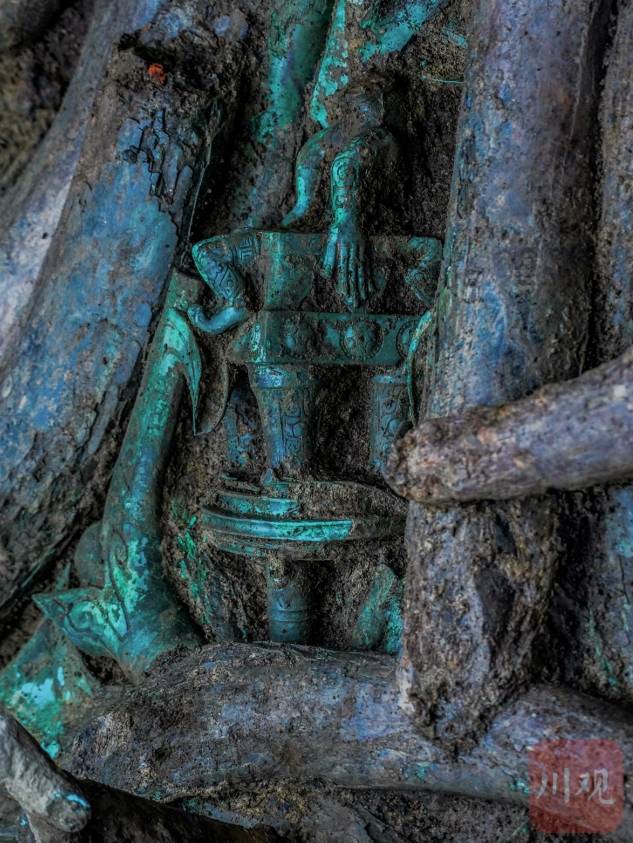 其中1件“奇奇怪怪青铜器”在网上“曝光”后,吸引了不少网友的注意:像是有人坐在上方,目前露出了修长的手臂和手指,上有纹身装饰,而两脚赤足卷曲,但手跟腿又完全不成比例,根据目测手指都跟弯曲的小腿差不多长。同时,考古队员给予这件器物的名字“奇奇怪怪青铜器”也让网友大呼太可爱。