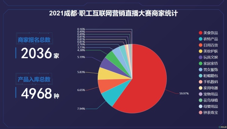 数据显示,直播大赛期间“成都货”产品入库总数4968件,包括美食饮品、农特产品、日用百货、美妆护肤、玩具文娱、家居家纺、男女服饰、鞋帽箱包、手机数码、家用电器、宠物用品、花鸟绿植、母婴用品、钟表珠宝等13大类,其中美食饮品占的比重最大,有59.97%。