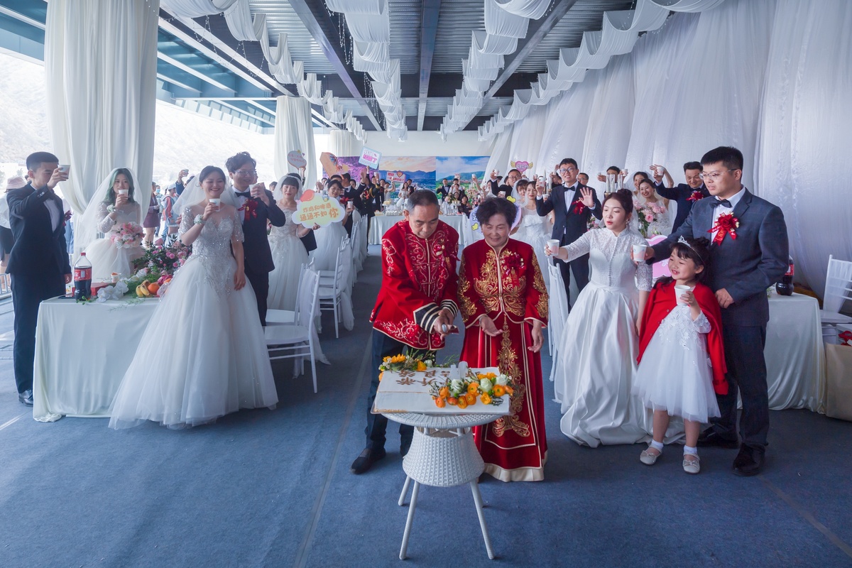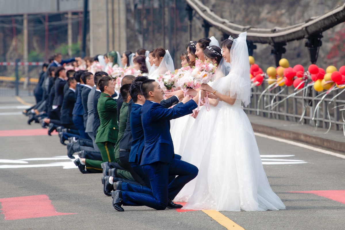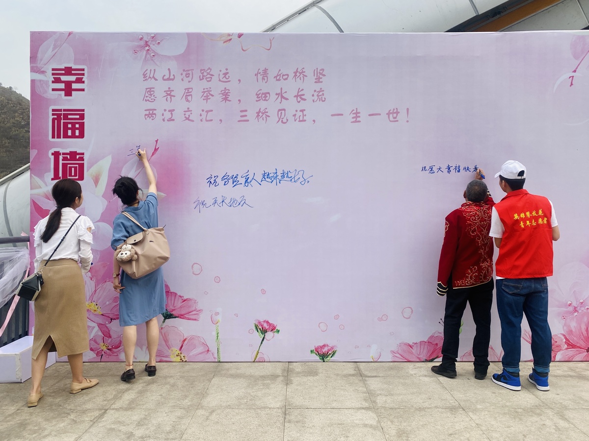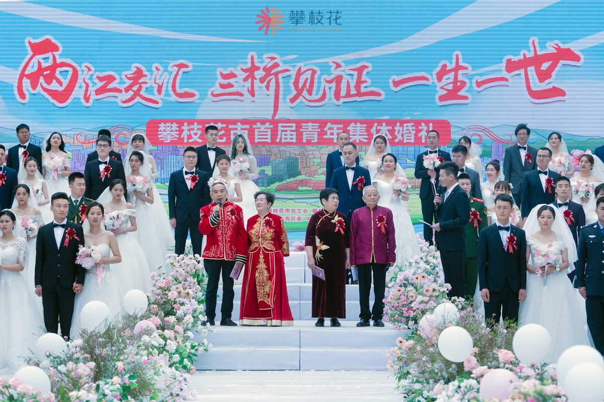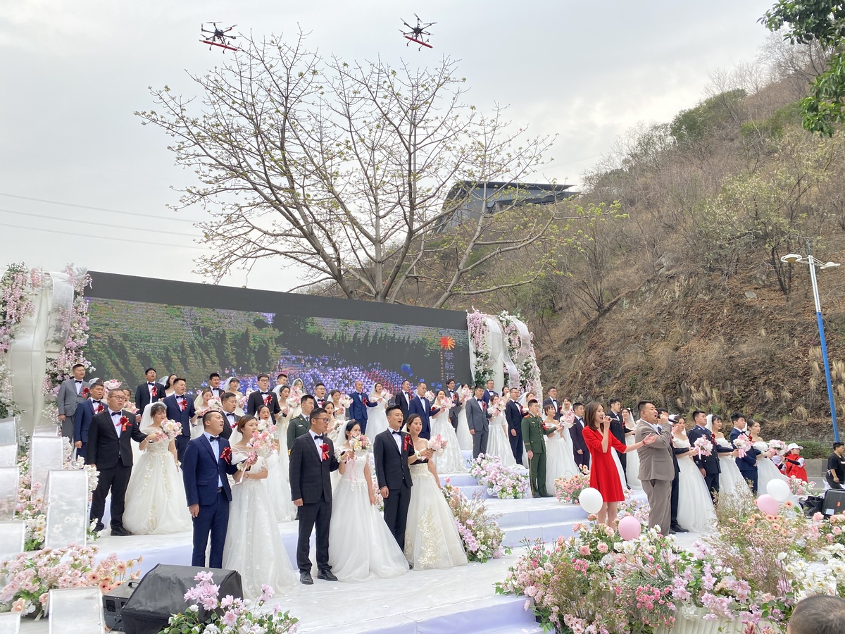 3月21日,雅砻江、金沙江交汇处,攀枝花“两江三桥”三线文化景观旁,攀枝花市首届青年集体婚礼隆重举行,28对新人在亲友祝福中携手迈入婚姻的殿堂。