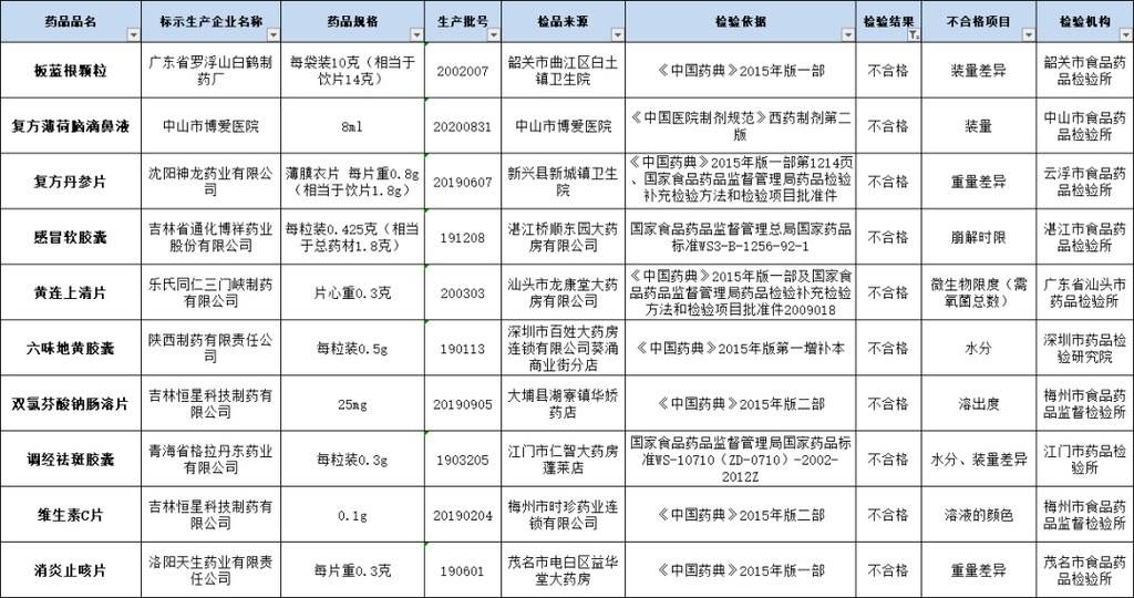 近日,国家药监局官网发布了关于10批次药品不符合规定的通告,其中标示为广东省罗浮山白鹤制药厂生产的板蓝根颗粒(生产批号2002007)等10批次药品不合格,赶紧检查一下,你家的小药箱有没有“中招”。