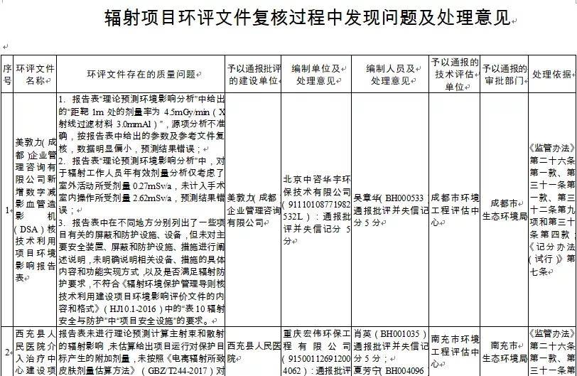处罚原因是啥?记者了解到,为贯彻落实“放管服”改革要求,强化辐射项目环评文件编制事中事后监管和审批业务指导,2020年10月以来,四川省生态环境厅进一步强化了对辐射项目环评文件审批日常管理,并对全省21个市(州)生态环境主管部门审批的36个辐射项目环境影响评价文件的编制质量进行了抽查复核。根据《建设项目环境影响报告书(表)编制监督管理办法》和《建设项目环境影响报告书(表)编制单位和编制人员失信行为记分办法(试行)》相关规定,共对3家建设单位予以通报批评,对3家环评文件编制单位及4名编制人员予以通报批评和失信记分,对2家技术评估单位和2个审批部门予以通报。