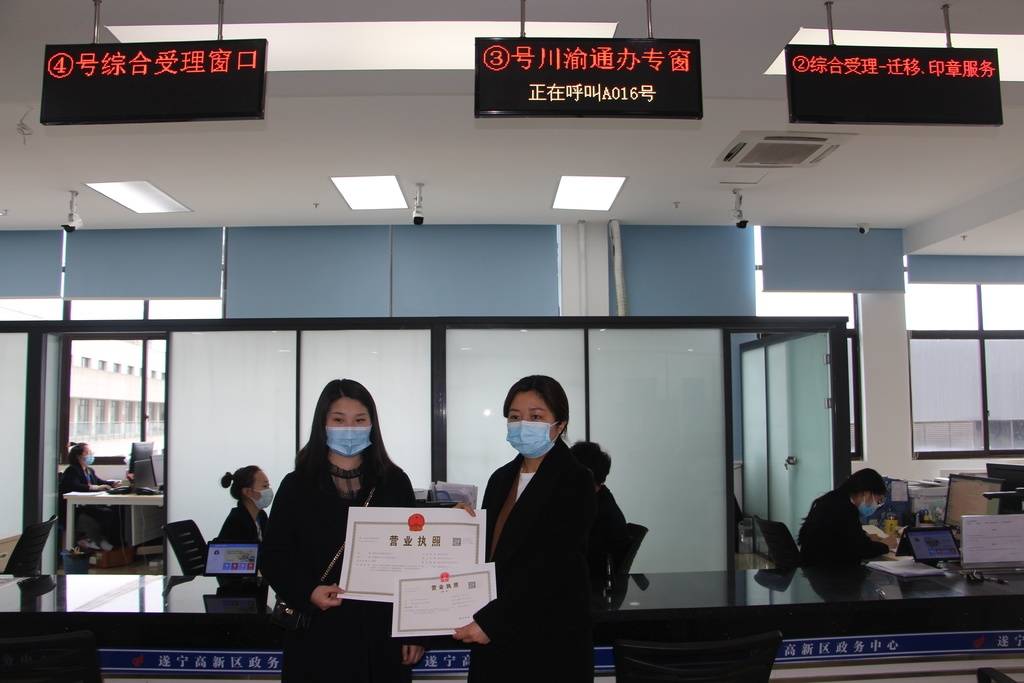“不用在遂宁和重庆之间来回跑,全程网上办理,在遂宁的窗口就能直接打印出带有重庆相关部门印章的营业执照,一个多小时就办完了,方便快捷。”3月22日,在遂宁高新区政务服务大厅“川渝通办专窗”前,重庆珵帛商贸有限公司法人蒋蔓拿到登记机关为“重庆市潼南区市场监督管理局”的营业执照。