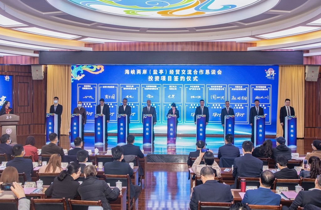 3月22日下午,第五届海峡两岸嫘祖文化交流活动暨海峡两岸(盐亭)经贸交流合作恳谈会在四川省盐亭县举行。当天,盐亭县人民政府与广东湛江电力有限公司、中石油西南油气田分公司、北京神州卓越石油有限公司等企业签订了9个项目投资协议,项目总投资49.6亿元,涉及生物医药、节能环保、文化教育、新材料等产业。