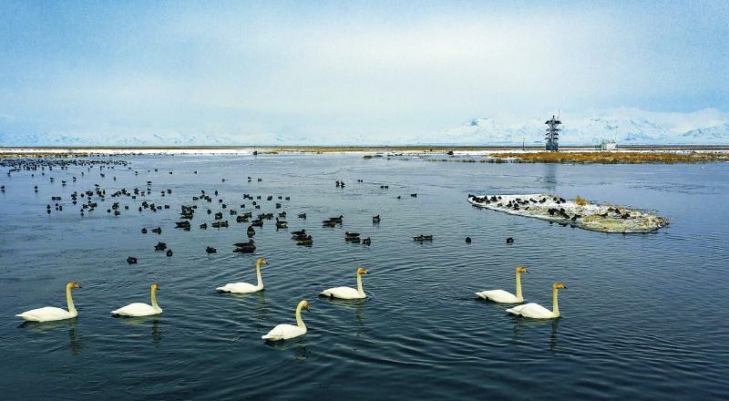 3月6日,若尔盖湿地国家级自然保护区在花湖设立的高科技无人观测塔(右后)正全天候观察湿地鸟类的活动。
