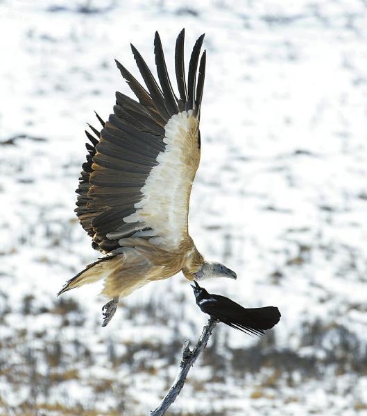 3月9日,在麦溪乡湿地,一只草原乌鸦和一只高山兀鹫争斗。